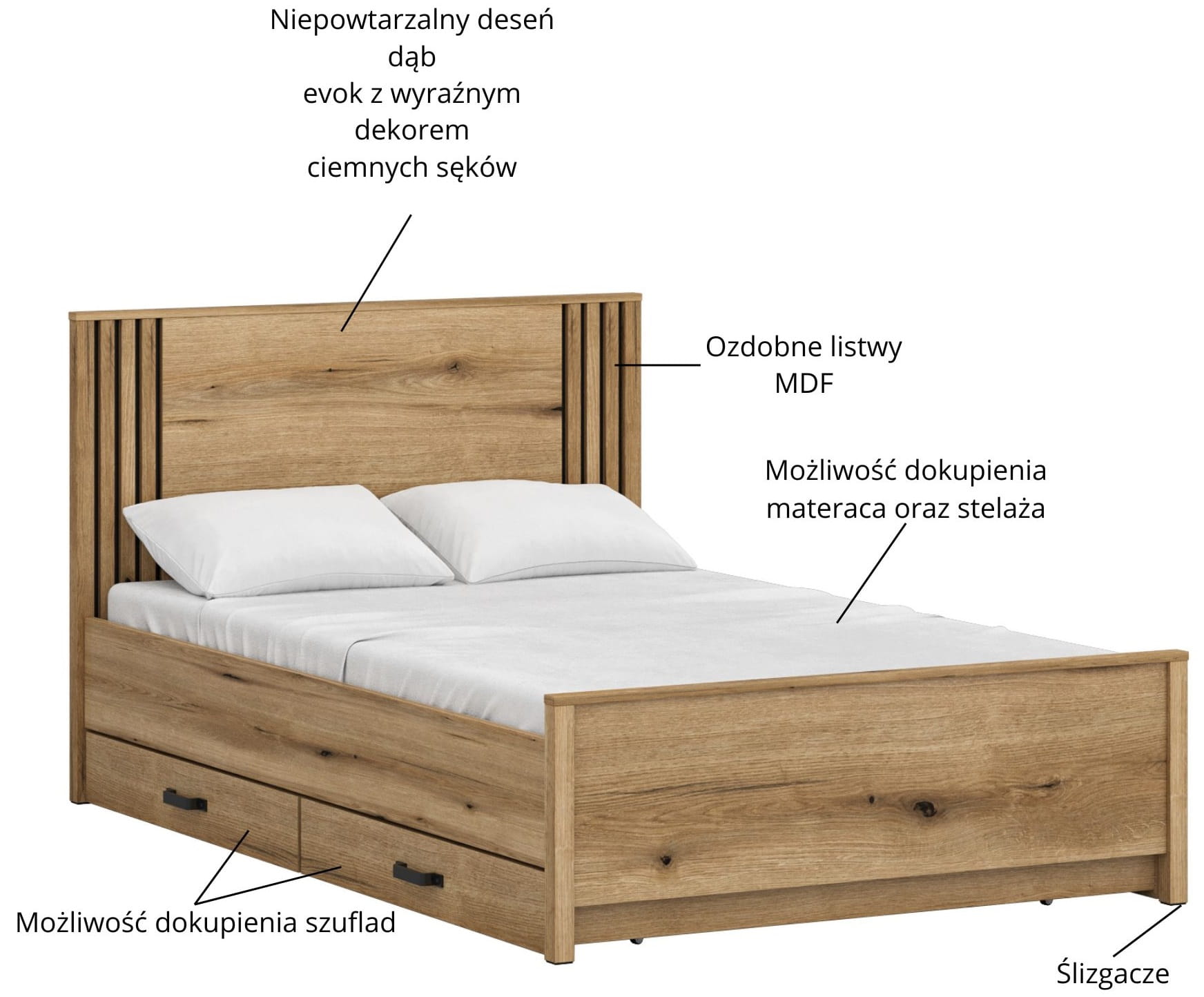 Łóżko sprzedawane bez stelaża i materaca.
