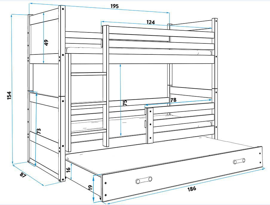 Łóżko piętrowe 3- osobowe RICO 190/80 biały