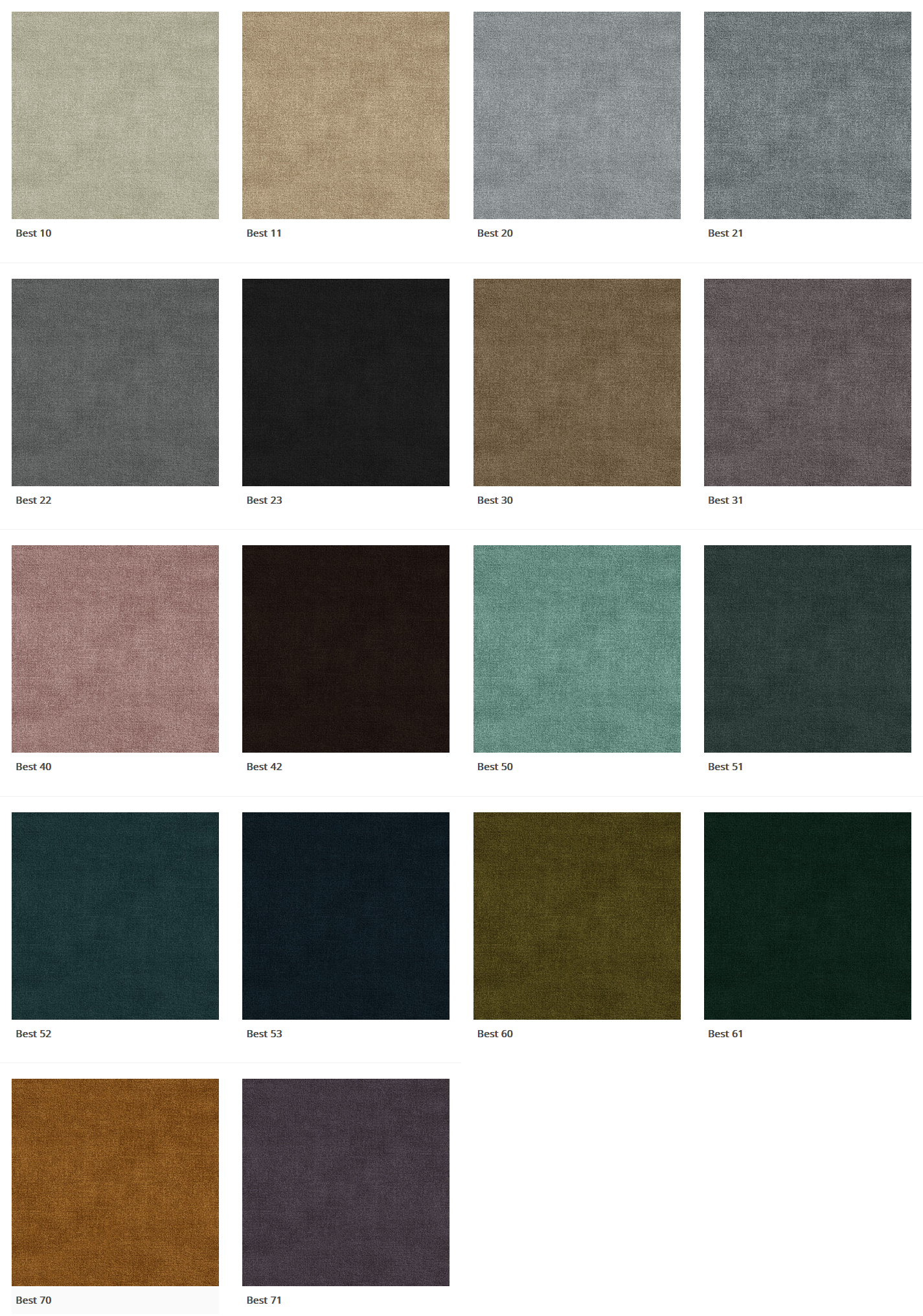 Łóżko możemy wykonać w innym odcieniu tkaniny Best. Paleta dostępnych kolorów znajduje się poniżej.