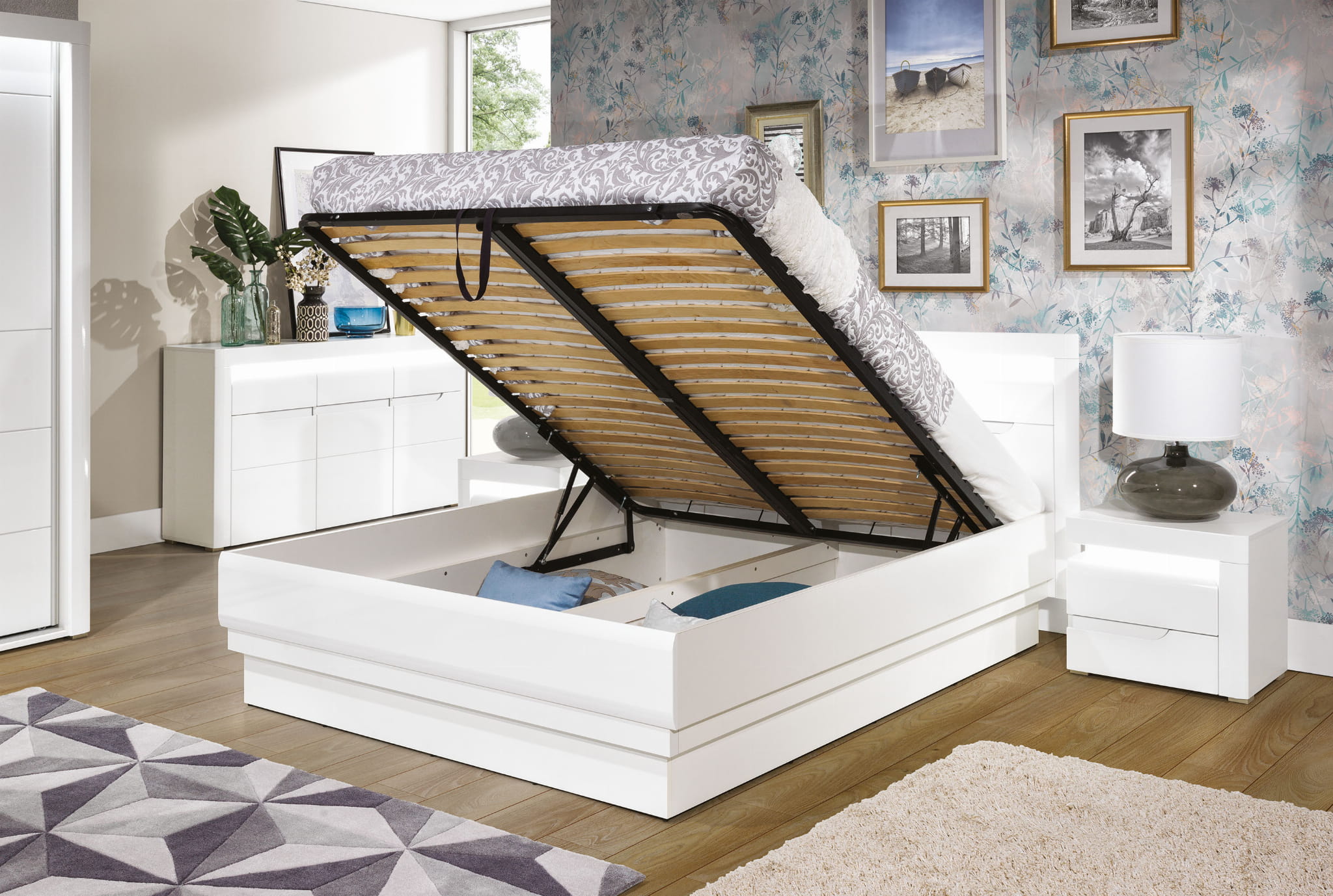 Możesz podnieść metalowy stelaż do góry, by skorzystać ze sporego pojemnika na pościel, z którym w łatwy sposób zachowasz porządek.