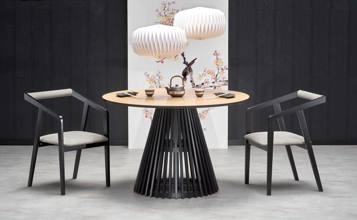 wymiary: fi120/77 cm, materiał: MDF + okleina naturalna - dębowa / drewno lite - bukowe / sklejka, kolor: blat - dąb naturalny, noga - czarny
