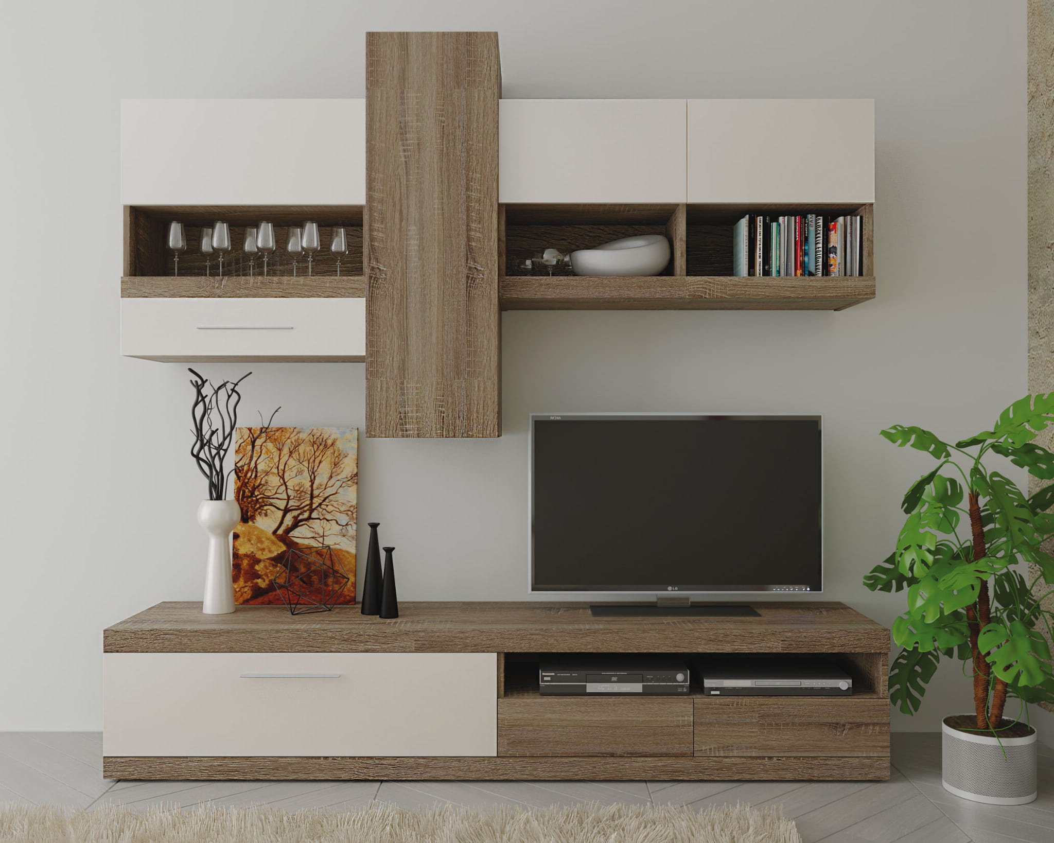 Niepowtarzalny zestaw meblowy w przystępnej cenie. Bardzo udana kolorystyka - połączenie klasycznego, naturalnego koloru dąb sonoma truflowy z jasnym szampańskim wpisuje się w nowoczesną stylistykę meblościanki. Dużym atutem Meblościanki Tokio jest jej funkcjonalność. Szafka wisząca wyposażona jest w otwarte półki, na których można umieścić książki lub ozdobne przedmioty. Górna część jest zabudowana uchylnymi frontami, za którymi na pojemnych półkach w komfortowy sposób można przechować ubrania lub różne przedmioty codziennego użytku, których nie chcemy eksponować. Szeroki blat szafki RTV to z kolei doskonała podstawa pod telewizor. Tuż pod nim znajdują się półki na sprzęt audio-wizualny, a poniżej zabudowane szuflady, w których można umieścić kable i inne akcesoria, które wyeksponowane zaburzałyby estetykę wnętrza. To wszystko tworzy jedną spójną całość świetnych mebli.