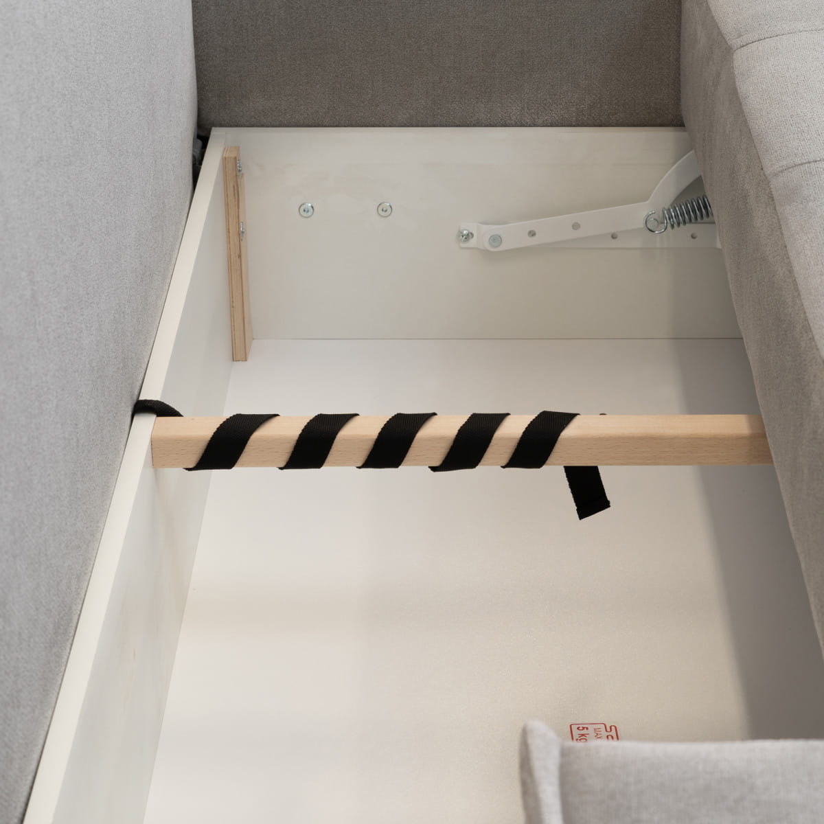Idealnym rozwiązaniem jest praktyczny schowek na pościel wbudowany pod siedziskiem, który pomieści wszelkie potrzebne dodatki, zapewniając przy tym porządek w salonie.