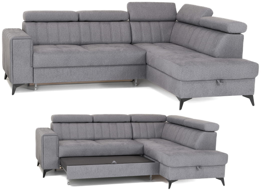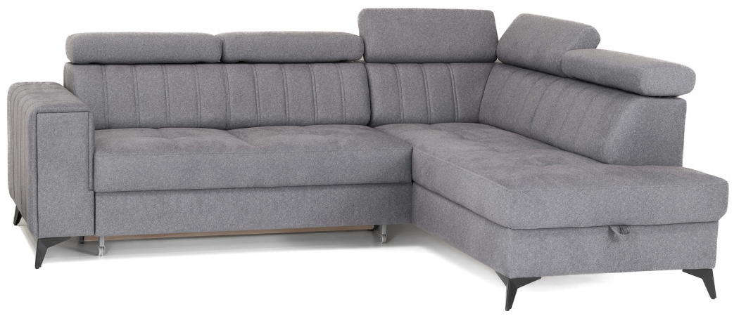 Wykonany na sprężynie falistej oraz piance wysokoelastycznej HR gwarantuje doskonały wypoczynek. Regulowane zagłówki pozwolą dostosować kąt nachylenia do indywidualnych preferencji użytkownika. Elementem dekoracyjnym są zarówno ozdobne przeszycia, jak i smukłe metalowe nogi nadające narożnikowi elegancji i lekkości.