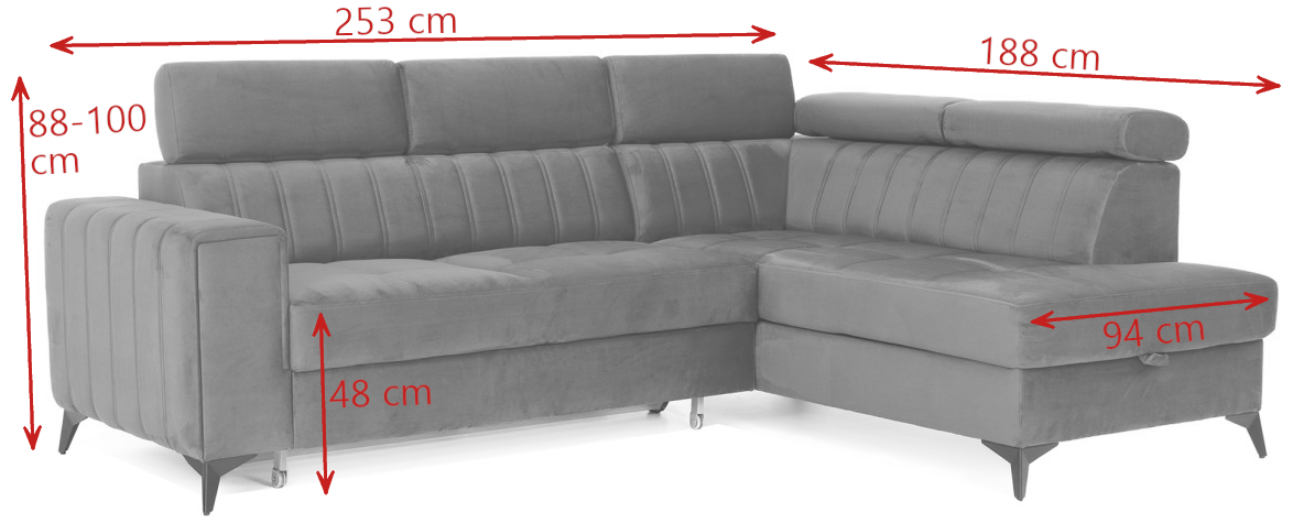 Mebel rozkłada się za pomocą prostego w obsłudze systemu typu DELFIN, który jednocześnie nie wymaga odsuwania od ściany. Dolną część siedziska należy wysunąć do przodu, a następnie podnieś dostawkę, by utworzyć jednolitą powierzchnię. Umożliwi Ci to szybko przekształcić narożnik w komfortowe łóżko o wymiarach 186x120 cm.