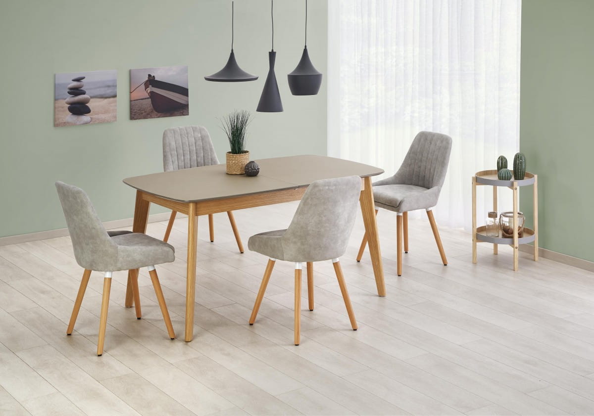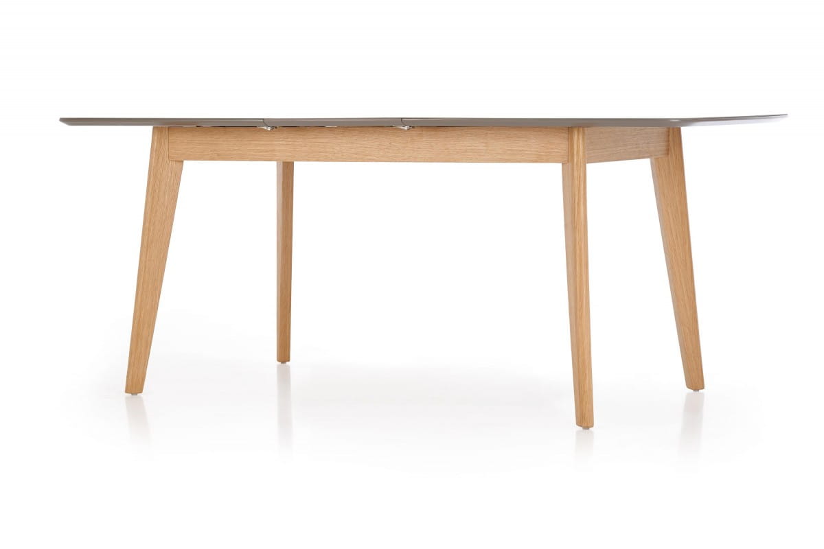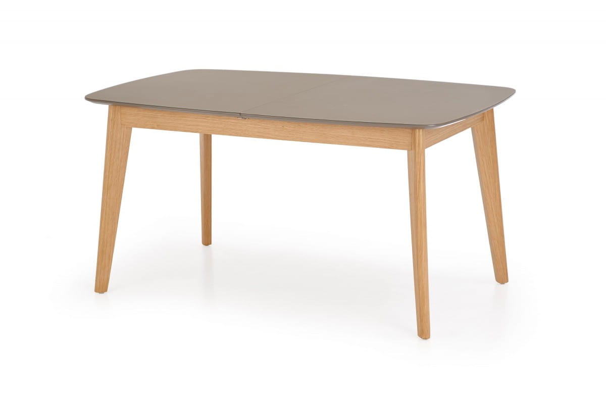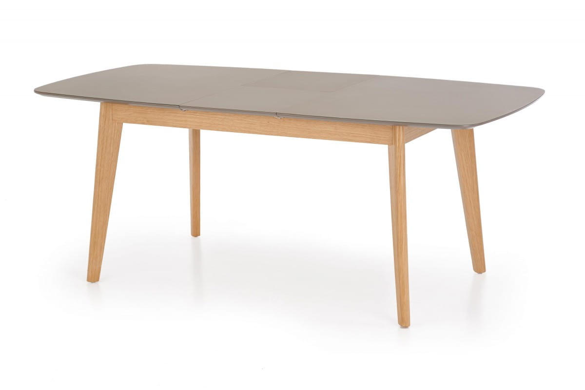 stół rozkładany, wymiary: 150-190/90/76 cm, materiał: szkło / MDF malowany / drewno lite, kolor: blat - popielaty mat, nogi - dąb naturalny