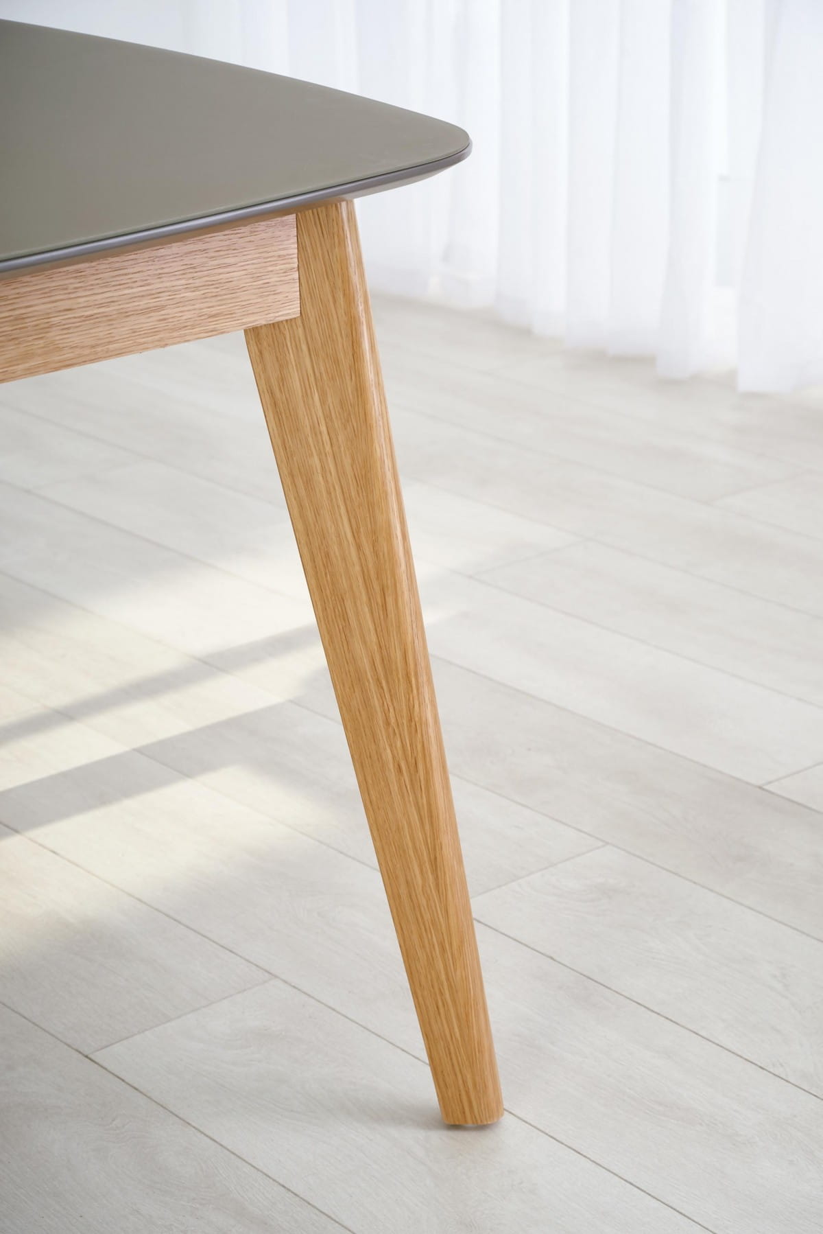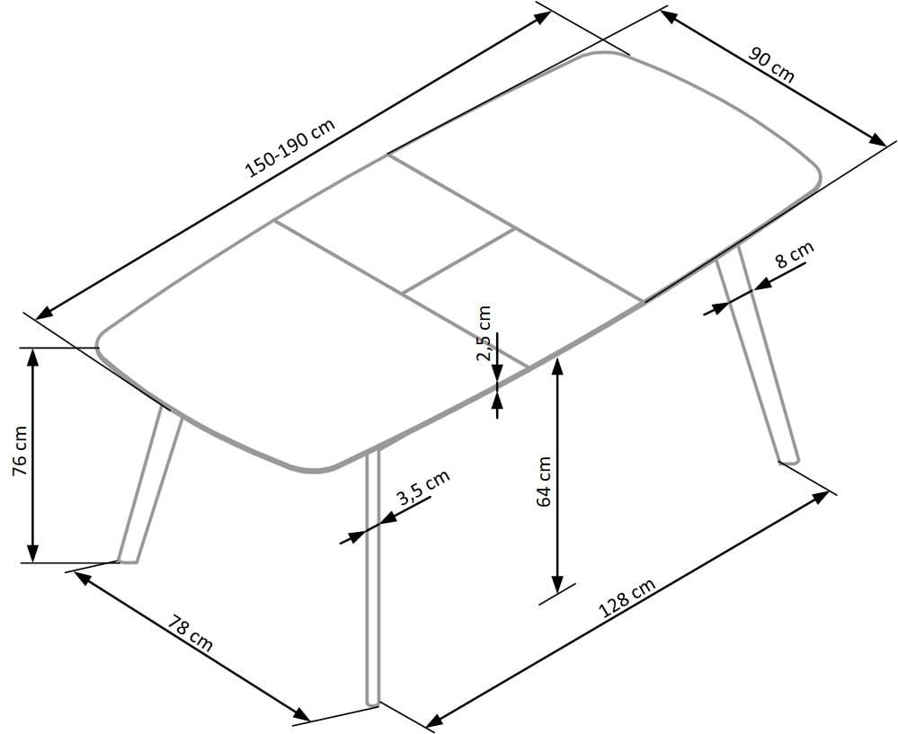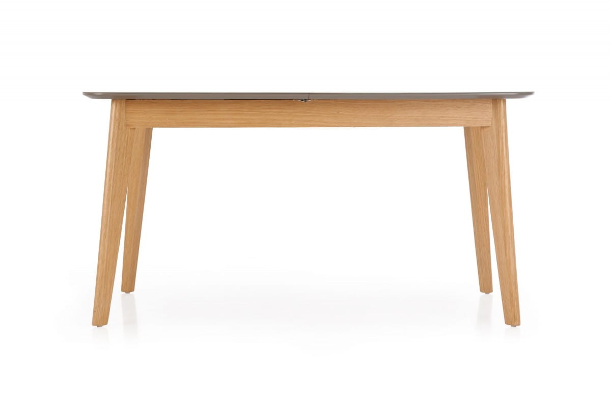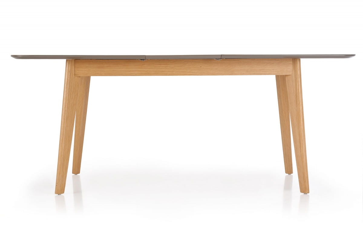 stół rozkładany, wymiary: 150-190/90/76 cm, materiał: szkło / MDF malowany / drewno lite, kolor: blat - popielaty mat, nogi - dąb naturalny