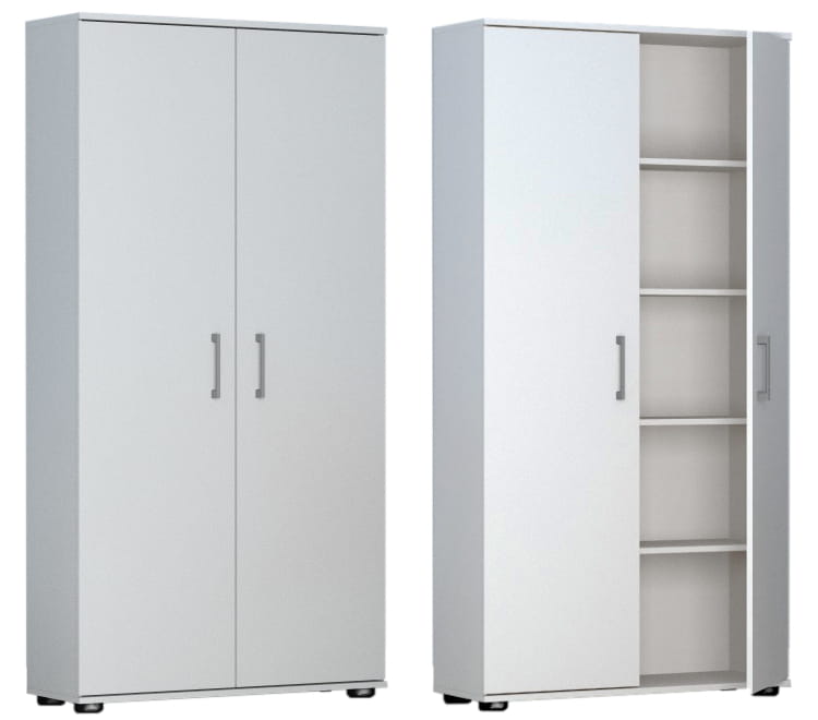 Regał wyposażono w dwoje drzwiczek, za którymi znajduje się pięć półek.