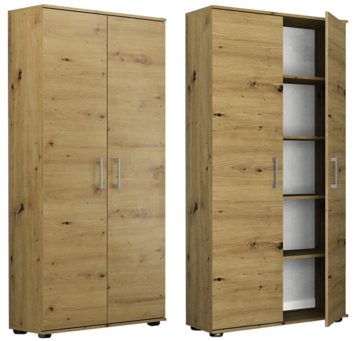 Regał wyposażono w dwoje drzwiczek, za którymi znajduje się pięć półek.