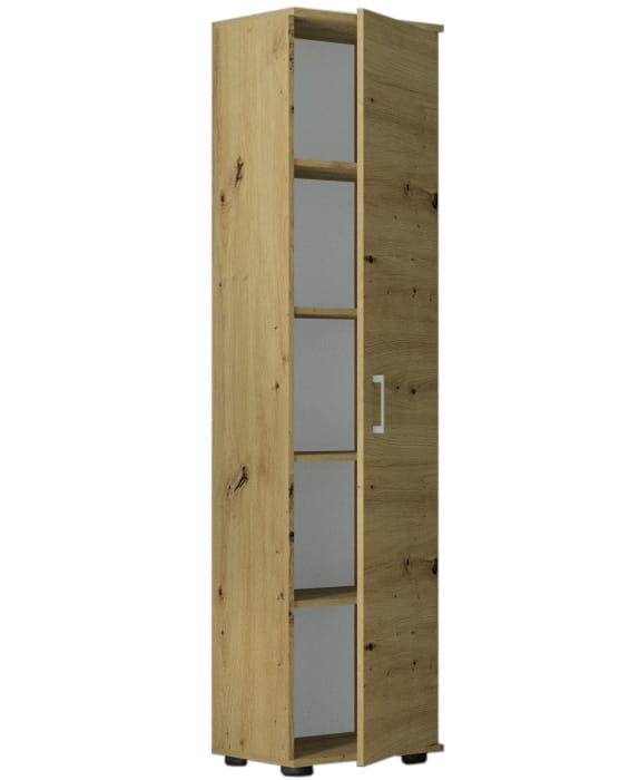 Regał wyposażono w drzwiczki, za którymi znajduje się pięć półek.