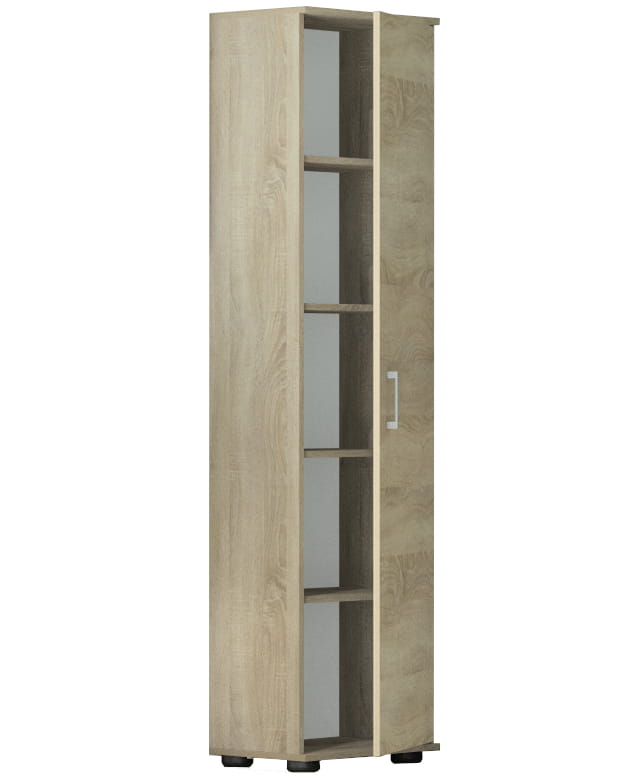 Regał wyposażono w drzwiczki, za którymi znajduje się pięć półek.