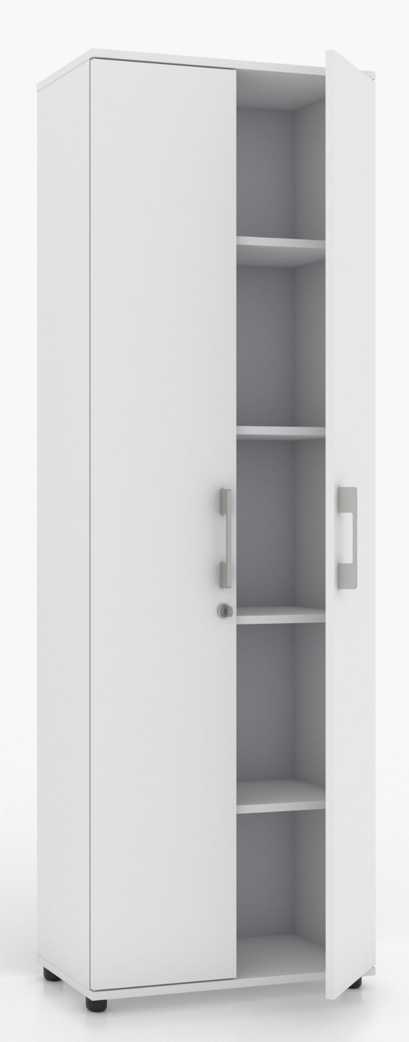 Regał wyposażono w dwoje drzwiczek, za którymi znajduje się pięć półek.