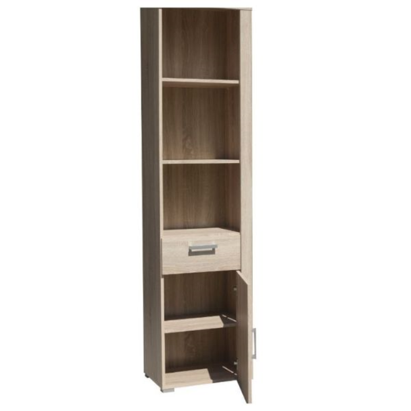 Regał DAMIS z otwartymi i zamykanymi półkami oraz z szufladą to idealne miejsce na przechowywanie wszystkich niezbędnych rzeczy. Jasny kolor dąb sonoma i uniwersalne uchwyty dodają bryle surowości a tym samym otwierają szerokie możliwości aranżacji wnętrz w zależności od upodobań użytkowników. Dodając do tego prostą formę i minimalistyczny design otrzymujemy mebel, który może znaleźć się w wyposażeniu każdego pokoju dziennego, jadalni, pokoju młodzieżowego lub przedpokoju.