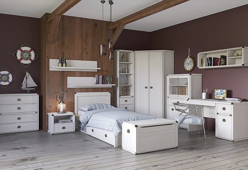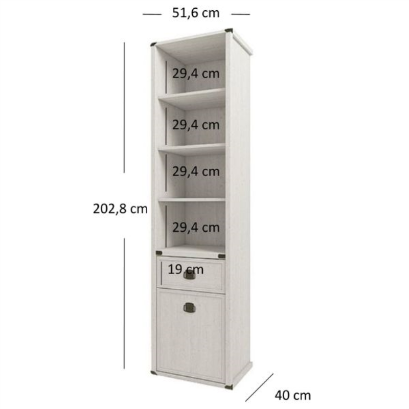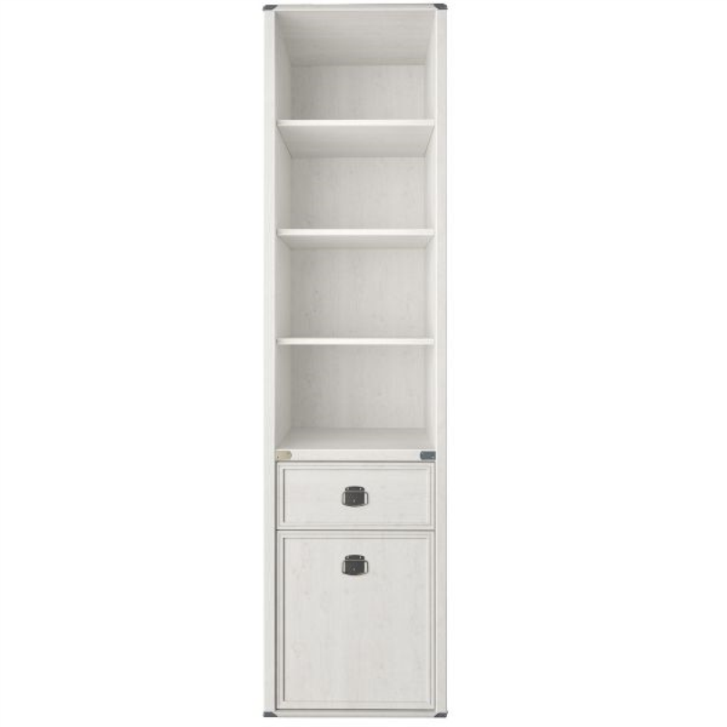 Regał to wielofunkcyjny mebel, który może stać się wygodną biblioteczką, miejscem na ciekawe dekoracje lub przestrzenią na dokumenty biurowe. Ciekawa forma kolekcji MAGELLAN przypadnie do gustu miłośnikom stylu marynistycznego. Metalowe zdobienia i uchwyty zwiększają atrakcyjność kolekcji i wspaniale odznaczają się na jasnym dekorze sosny vintage. Regały doskonale uzupełniają takie pomieszczenia jak: salon, pokój dzienny, korytarz, sypialnia, gabinet, home office, pokój młodzieżowy, a nawet jadalnia.