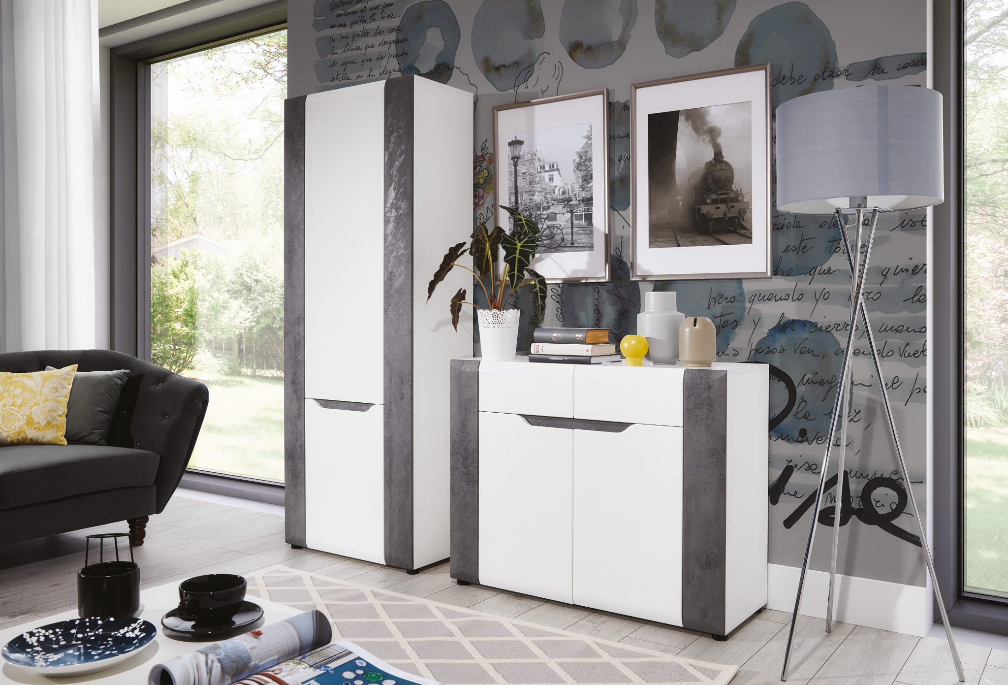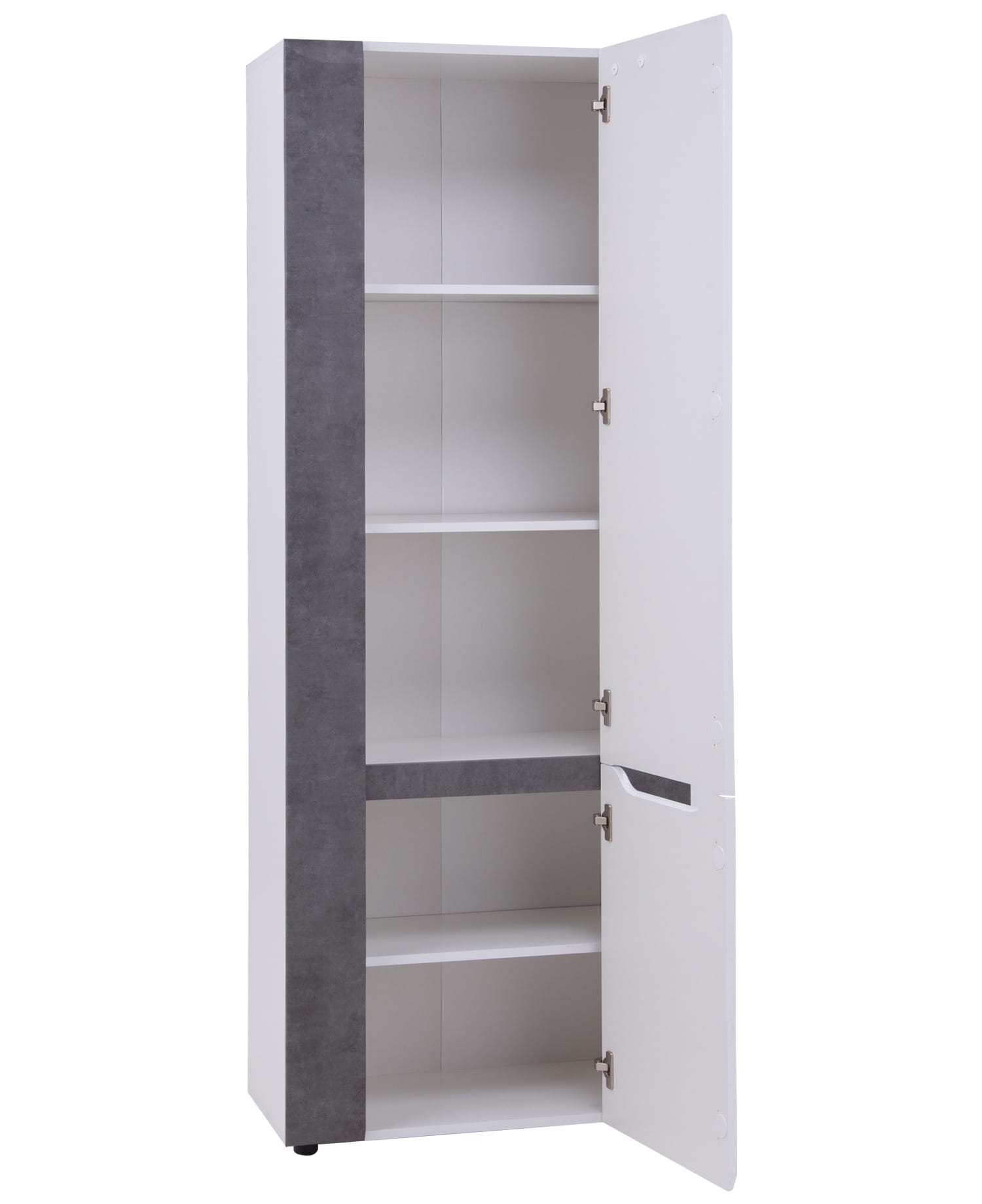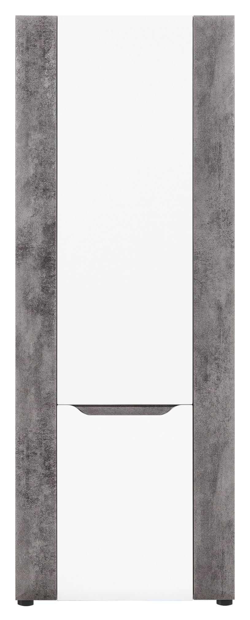 BRANDO B6 przykuwa wzrok kolorystyką łączącą biel z odcieniem betonu, która nadaje konstrukcji szyku oraz niebanalnej klasy. Natomiast wyjątkowym akcentem rozświetlającym wnętrze jest wykończenie frontu na wysoki połysk, co dobrze komponuję się w zestawieniu z innymi dekorami, tworząc ogromne możliwości aranżacyjne.