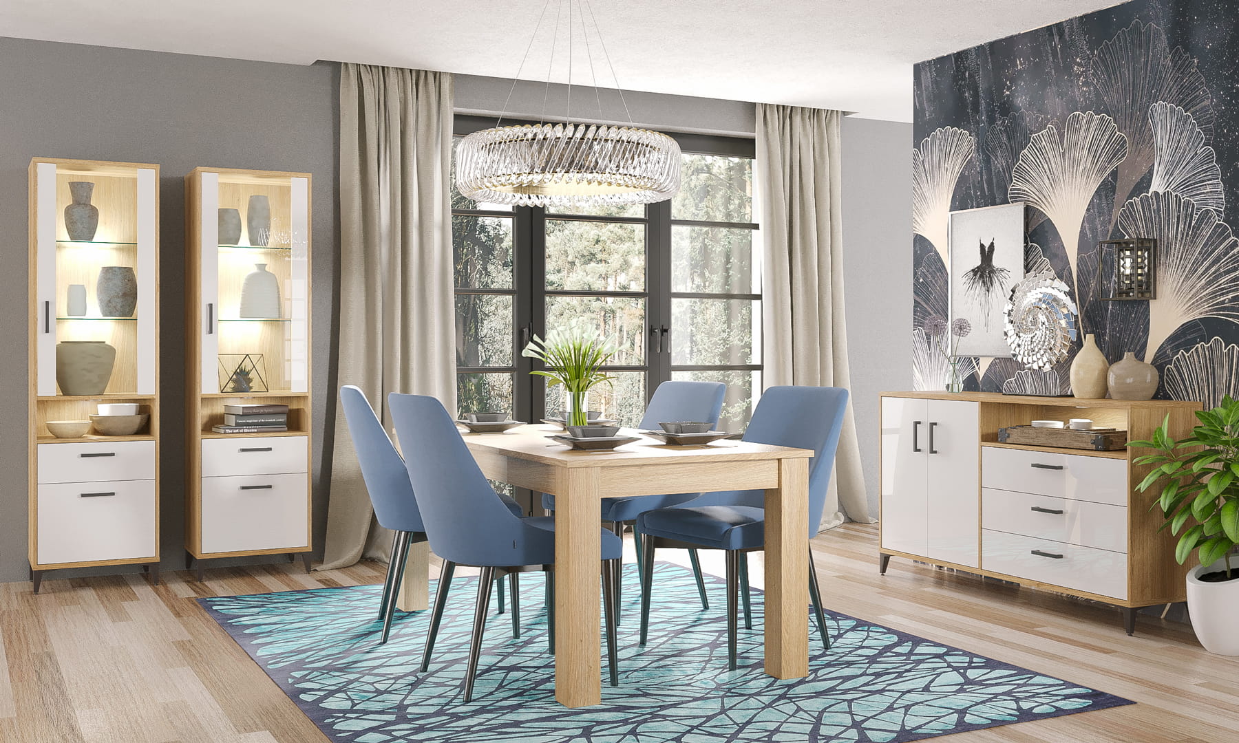Charakterystyczną cechą COLIN CN17 jest zestawienie dwóch kolorów dębu nagano z białym połyskiem, które sprawią, że wnętrze zyskuje niepowtarzalny styl.