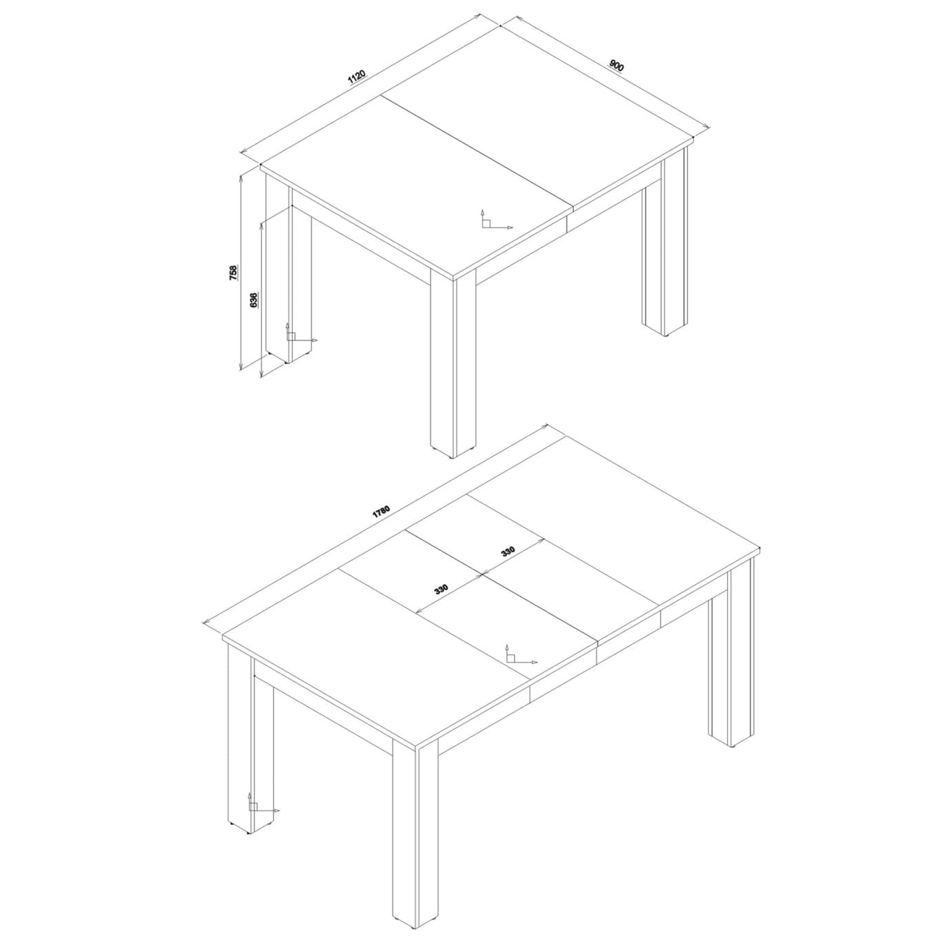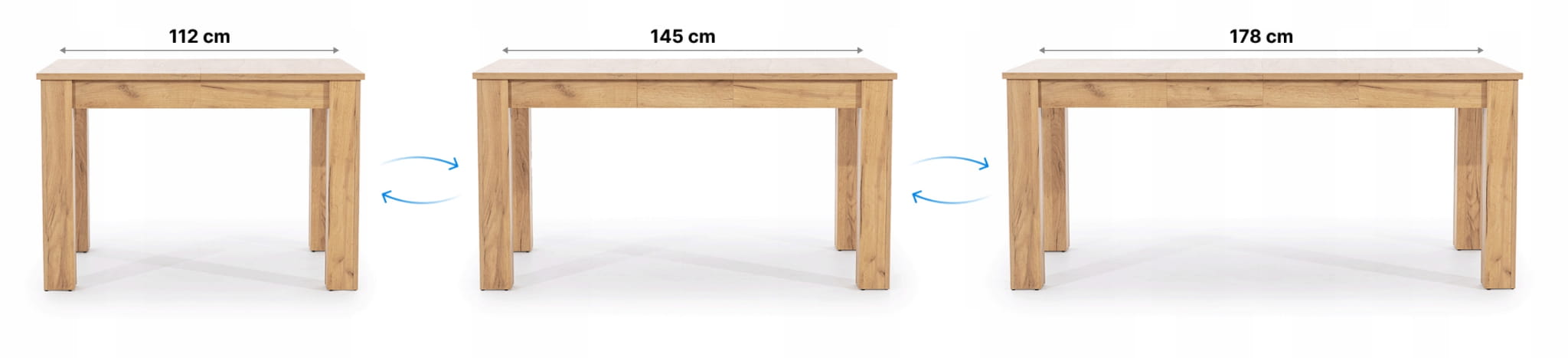 Stół można rozłożyć do 178 cm poprzez przesunięcie blatu wraz z nogami i dołożeniu dwóch wkładek o długości 33 cm.