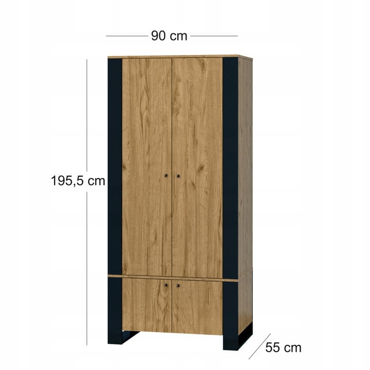 Szafa 4d posiada drążek na wieszaki oraz półki, dzięki czemu pomieści wiele niezbędnych rzeczy przede wszystkim ubrań i dodatków. Czarne elementy wydobywają piękno odcienia dąb craft złoty. Nowoczesny styl łączy klasyczne drewno z industrialnymi, metalowymi wstawkami oraz minimalistycznymi uchwytami. Kolekcja WOOD to masywne i stabilne meble idealne dla wielbicieli nowoczesnych rozwiązań.