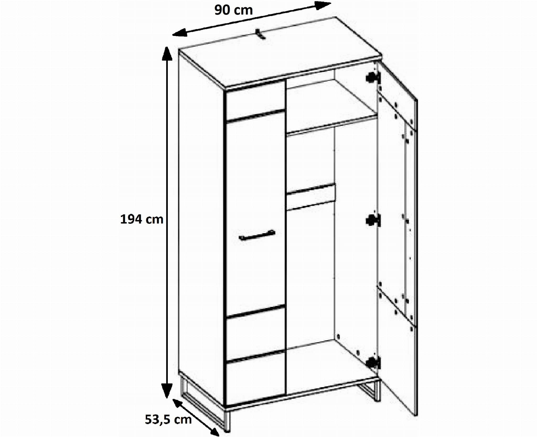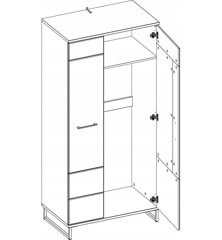 Dwudrzwiową szafę wyposażono w drążek na wieszaki, na którym odwiesisz ubrania oraz wnękę w górnej części idealną do przechowania dodatkowych akcesoriów.