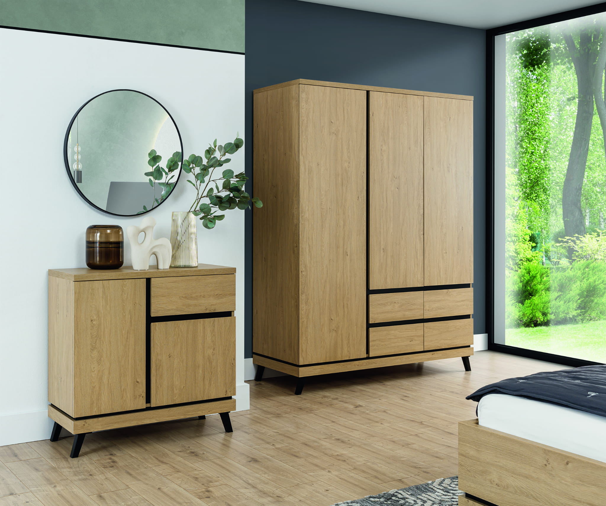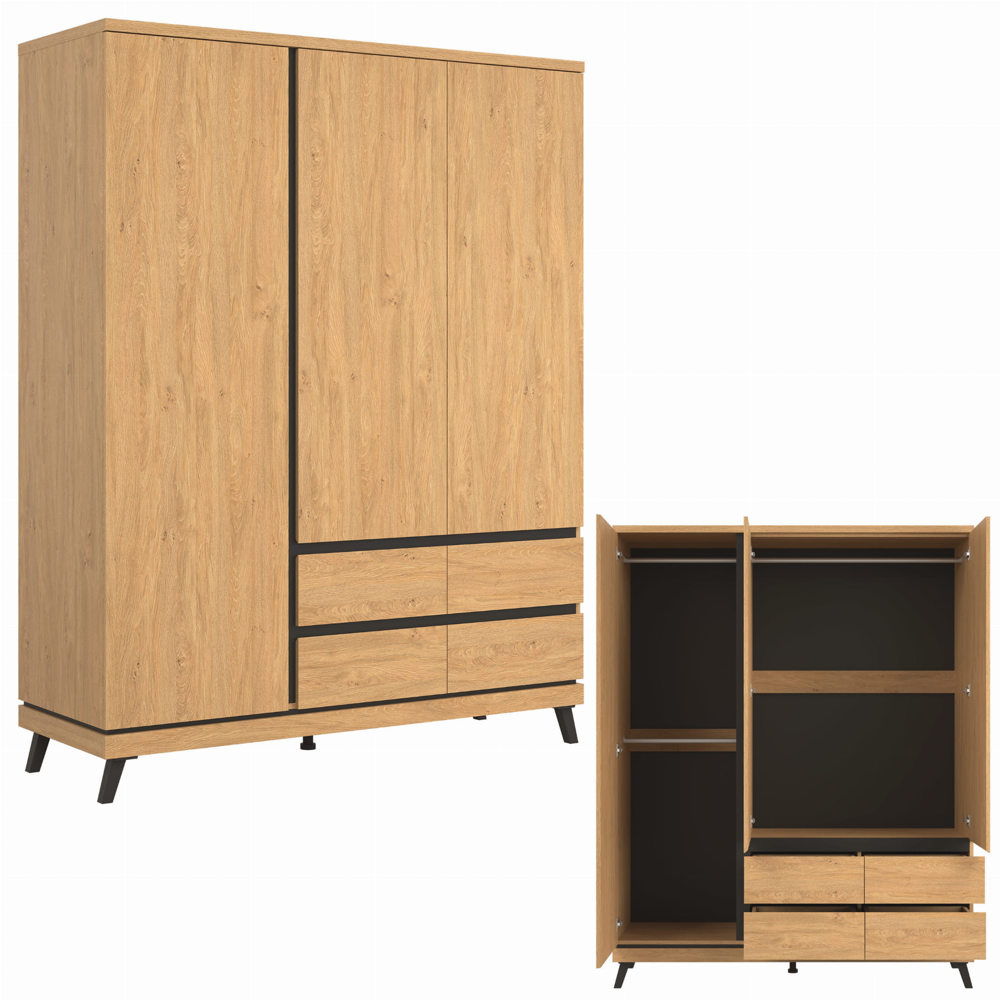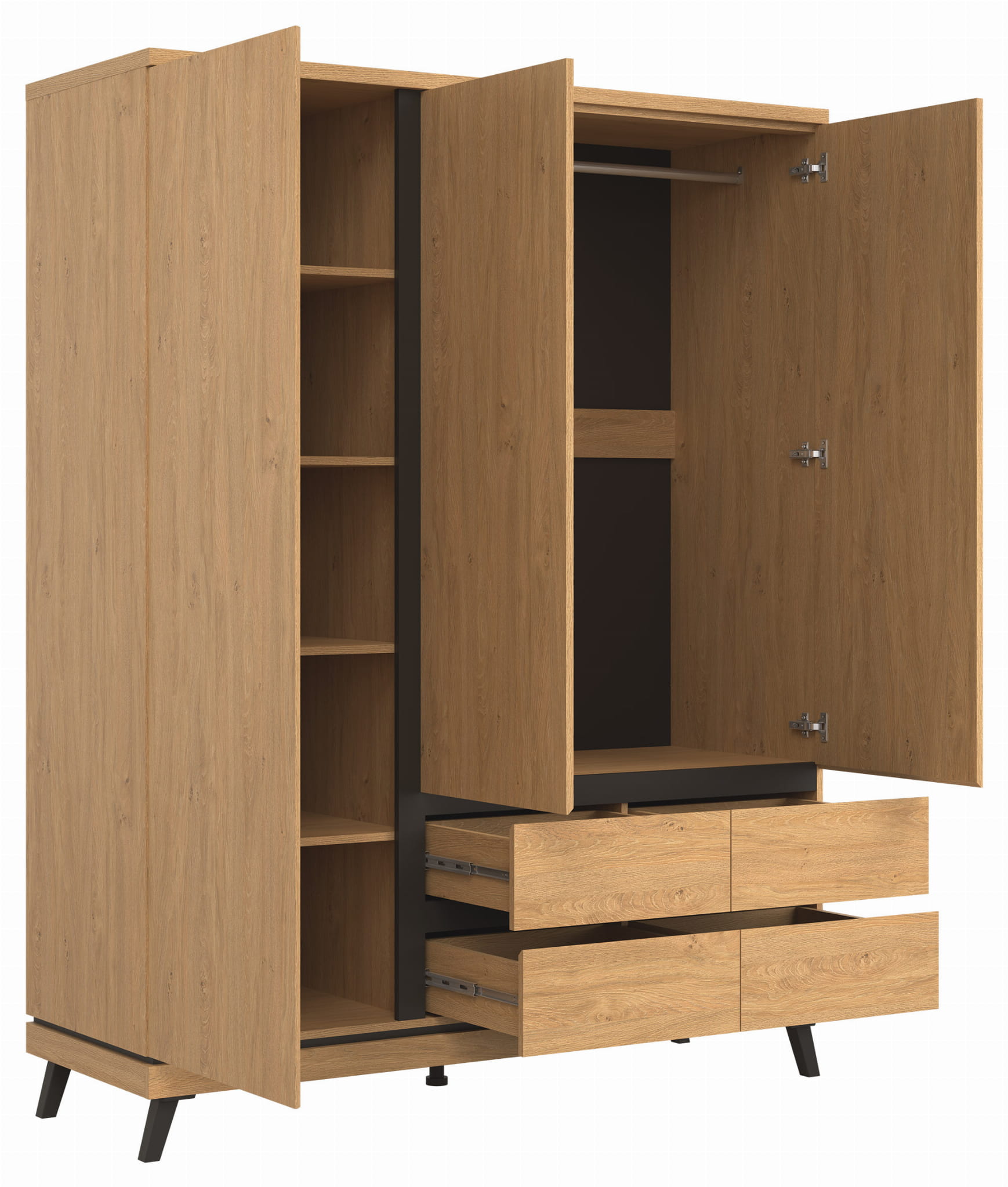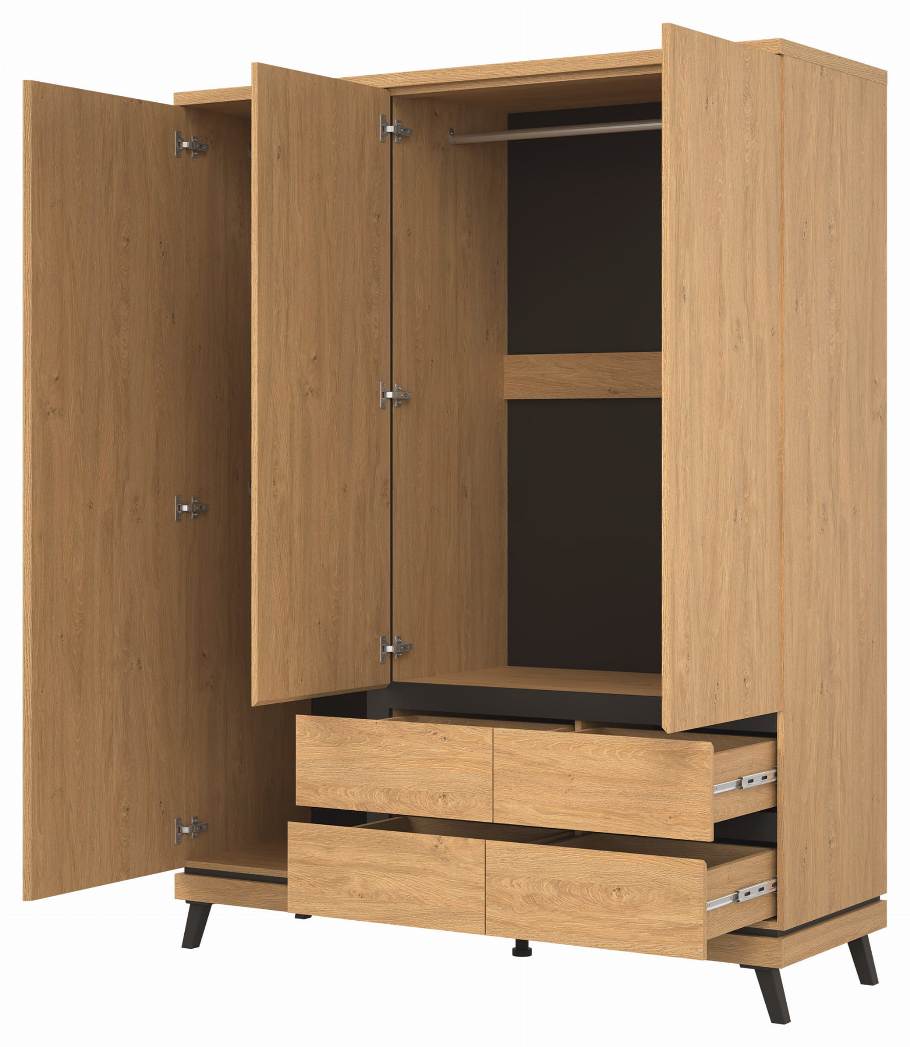 Mebel złożony jest z czterech szuflad wyposażonych w wysokogatunkowe prowadnice kulkowe GTV z pełnym wysuwem oraz trzech drzwi, za którymi znajdują się trzy drążki do zawieszenia ubrań.