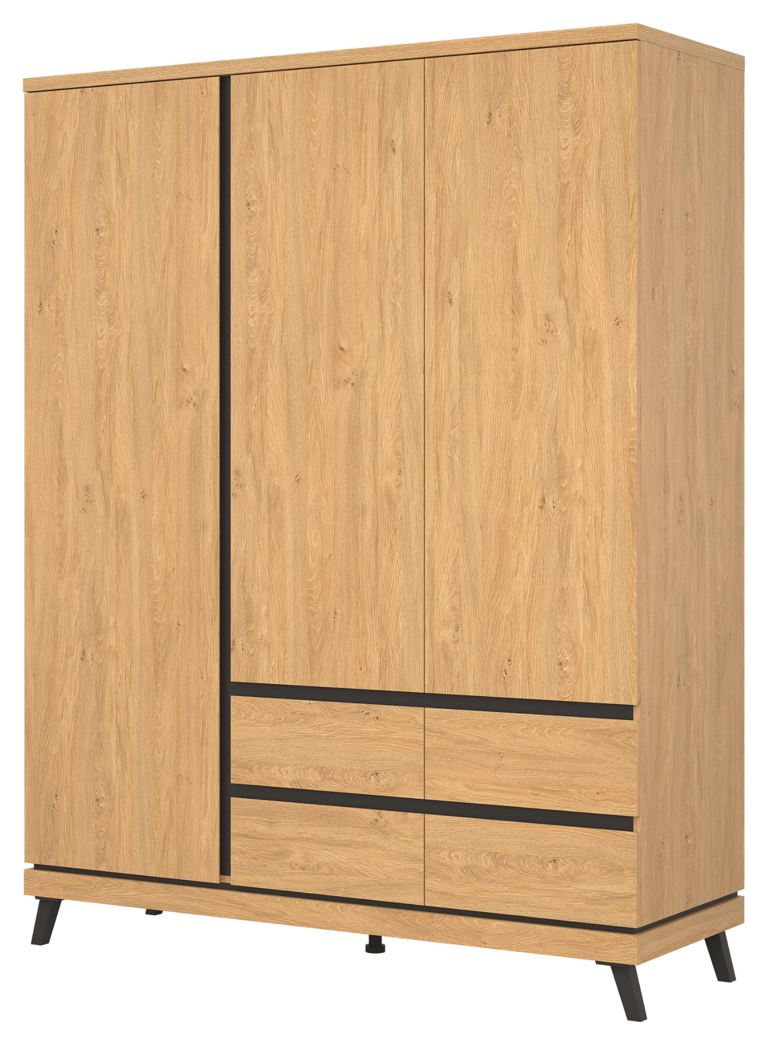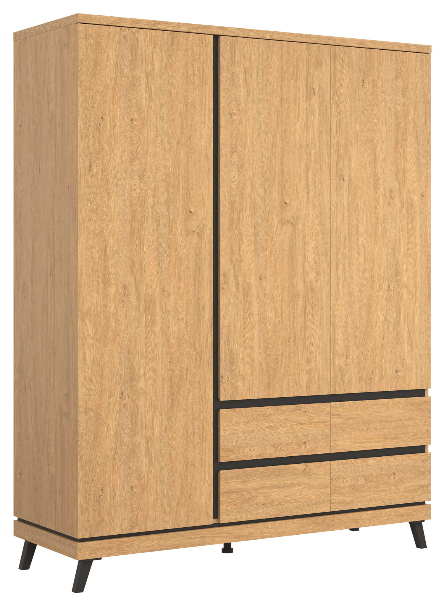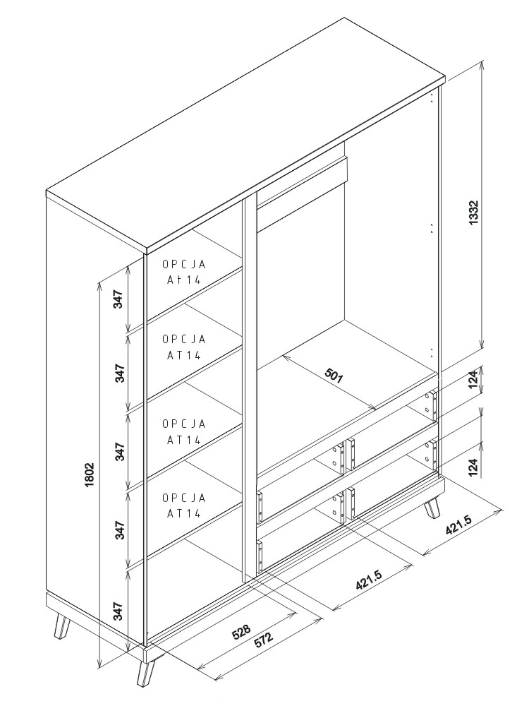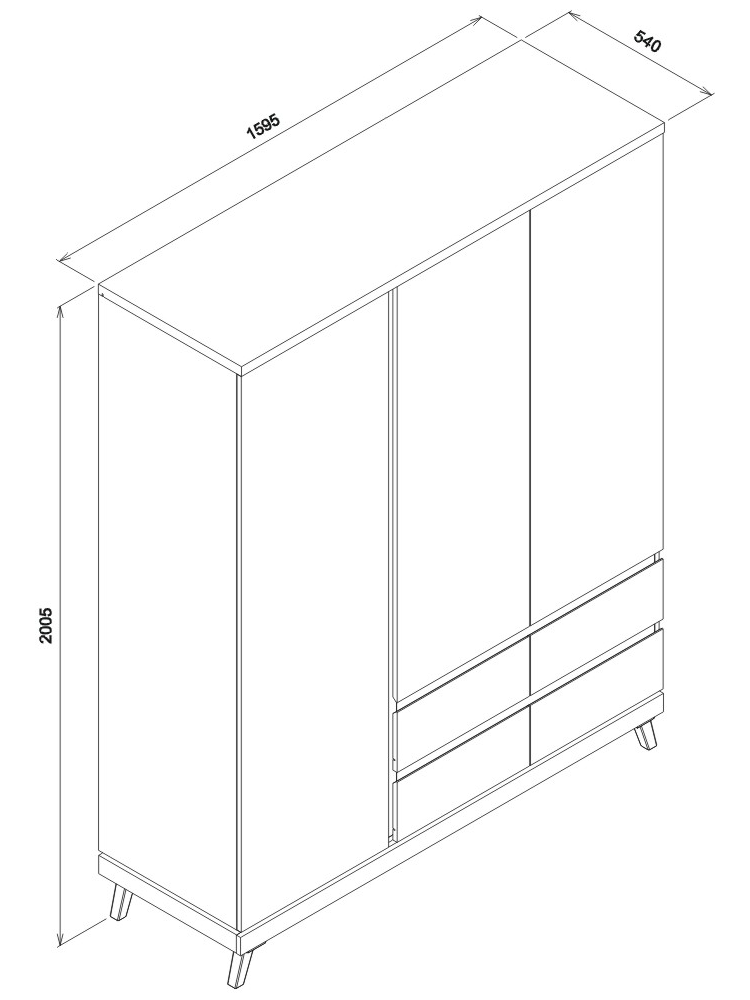Mebel złożony jest z czterech szuflad wyposażonych w wysokogatunkowe prowadnice kulkowe GTV z pełnym wysuwem oraz trzech drzwi, za którymi znajdują się trzy drążki do zawieszenia ubrań.