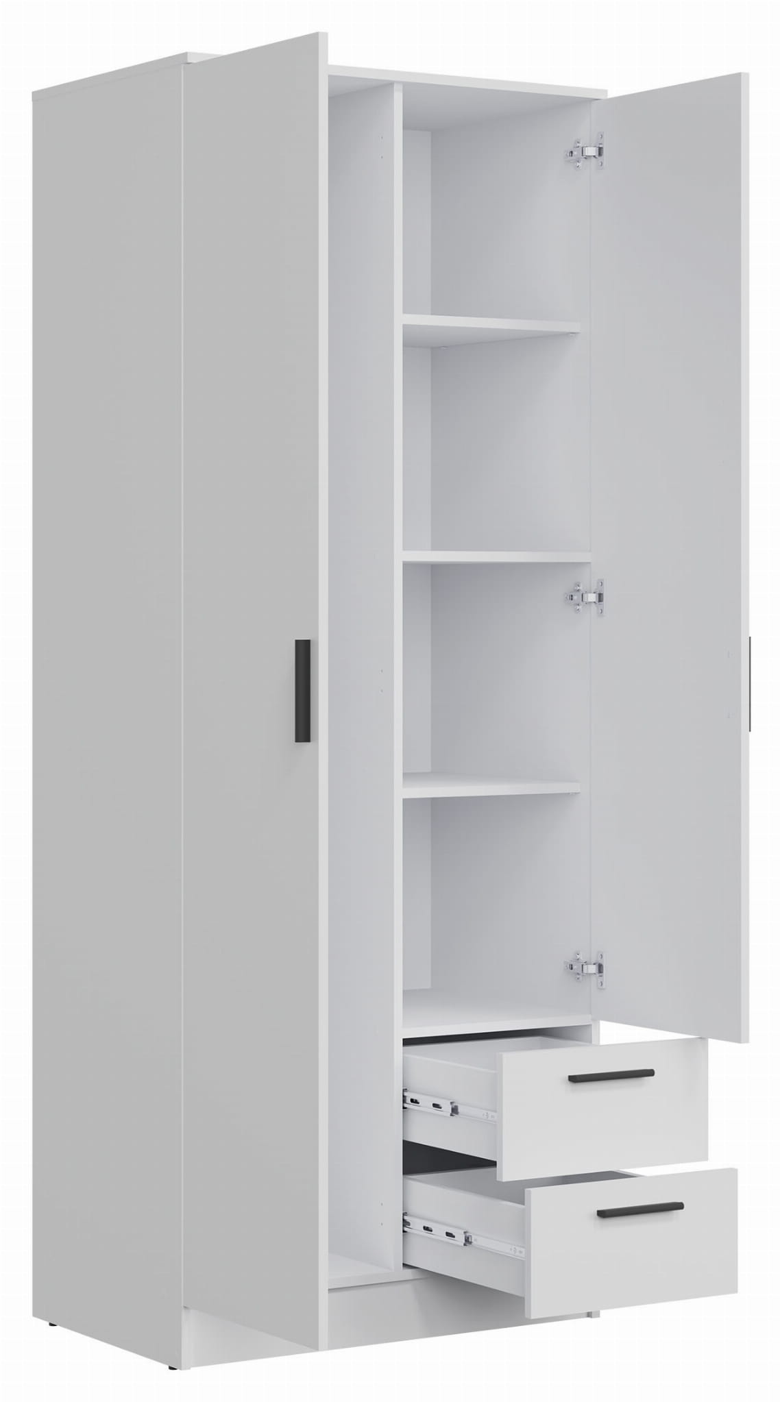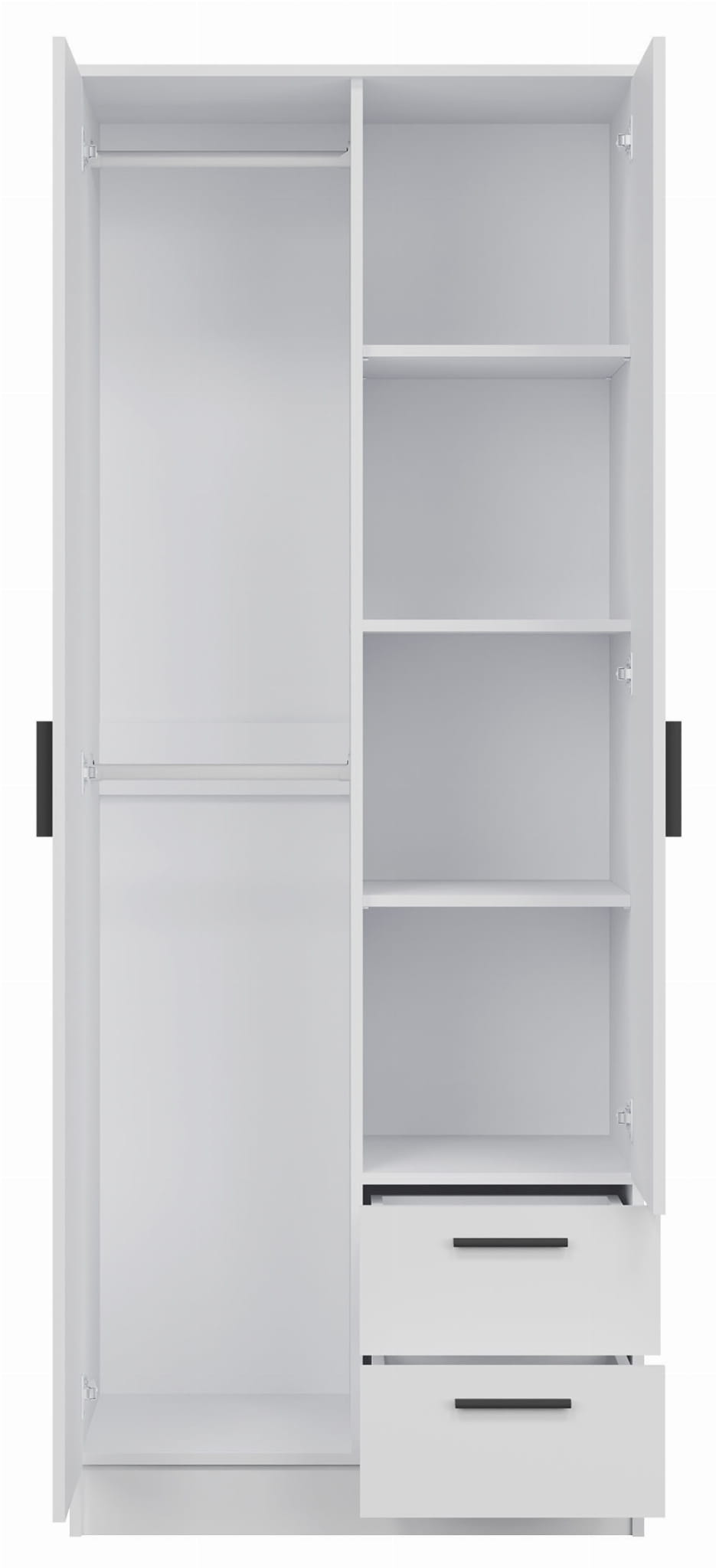 Dwudrzwiowa szafa kryje we wnętrzu dwa drążki, które pozwolą uzyskać wygodny dostęp do poszczególnych części twojej garderoby. W prawej części znajdują się cztery wnęki, w których możesz trzymać złożone ubrania. Dwie szuflady to idealne miejsce na drobne akcesoria.