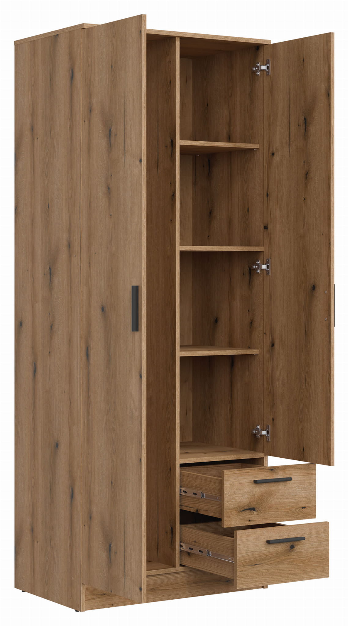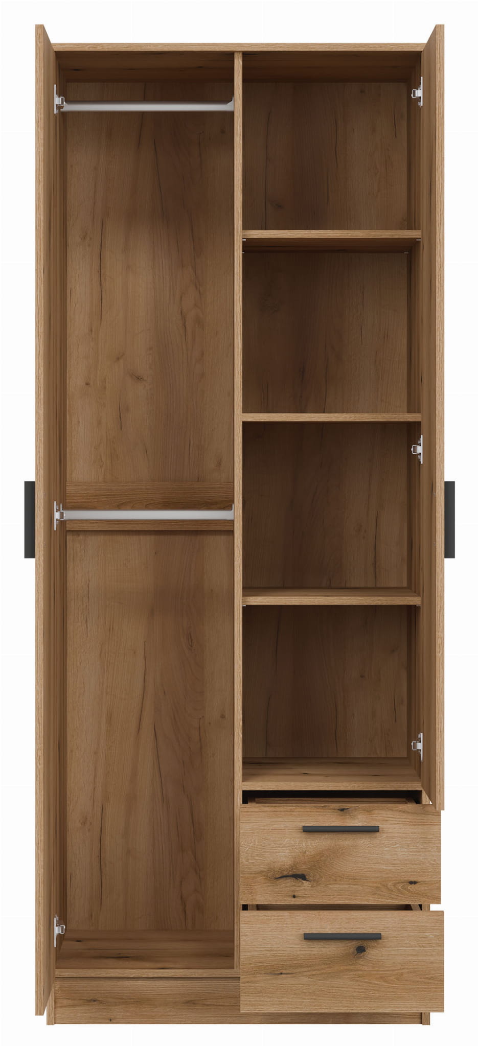 Dwudrzwiowa szafa kryje we wnętrzu dwa drążki, które pozwolą uzyskać wygodny dostęp do poszczególnych części twojej garderoby. W prawej części znajdują się cztery wnęki, w których możesz trzymać złożone ubrania. Dwie szuflady to idealne miejsce na drobne akcesoria.