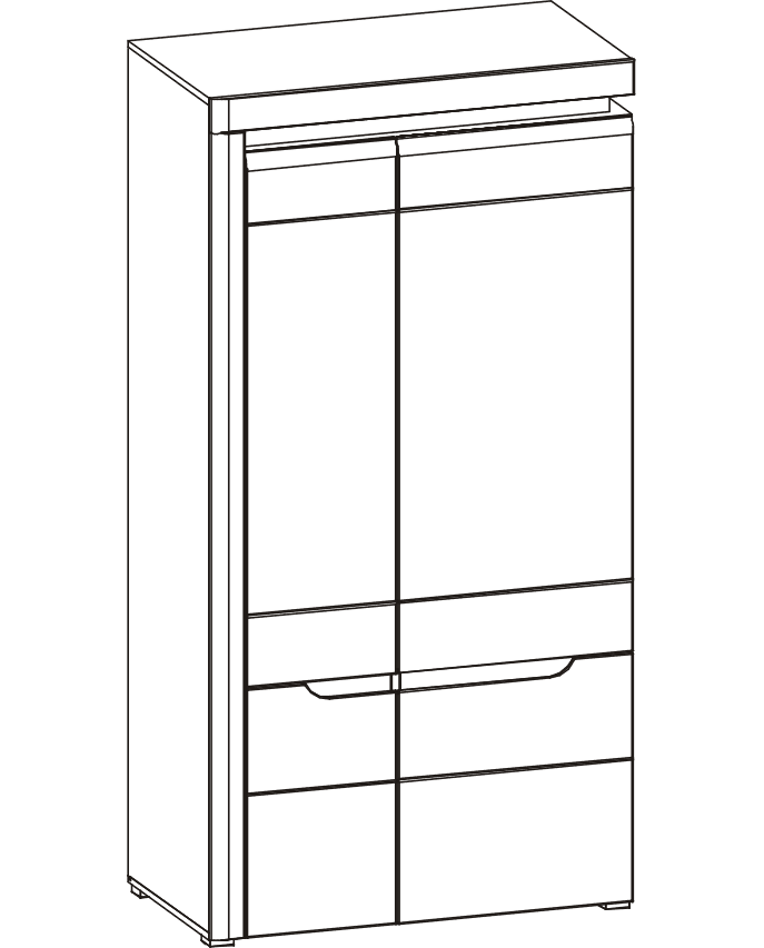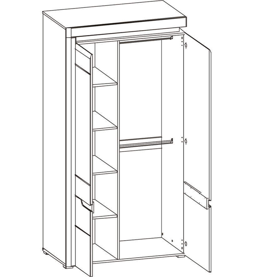 Mebel składa się dwóch otwieranych frontów, za którymi znajdują się dwie komory, jedna dzielona czterema półkami natomiast druga wyposażona w dwa drążki na wieszaki.