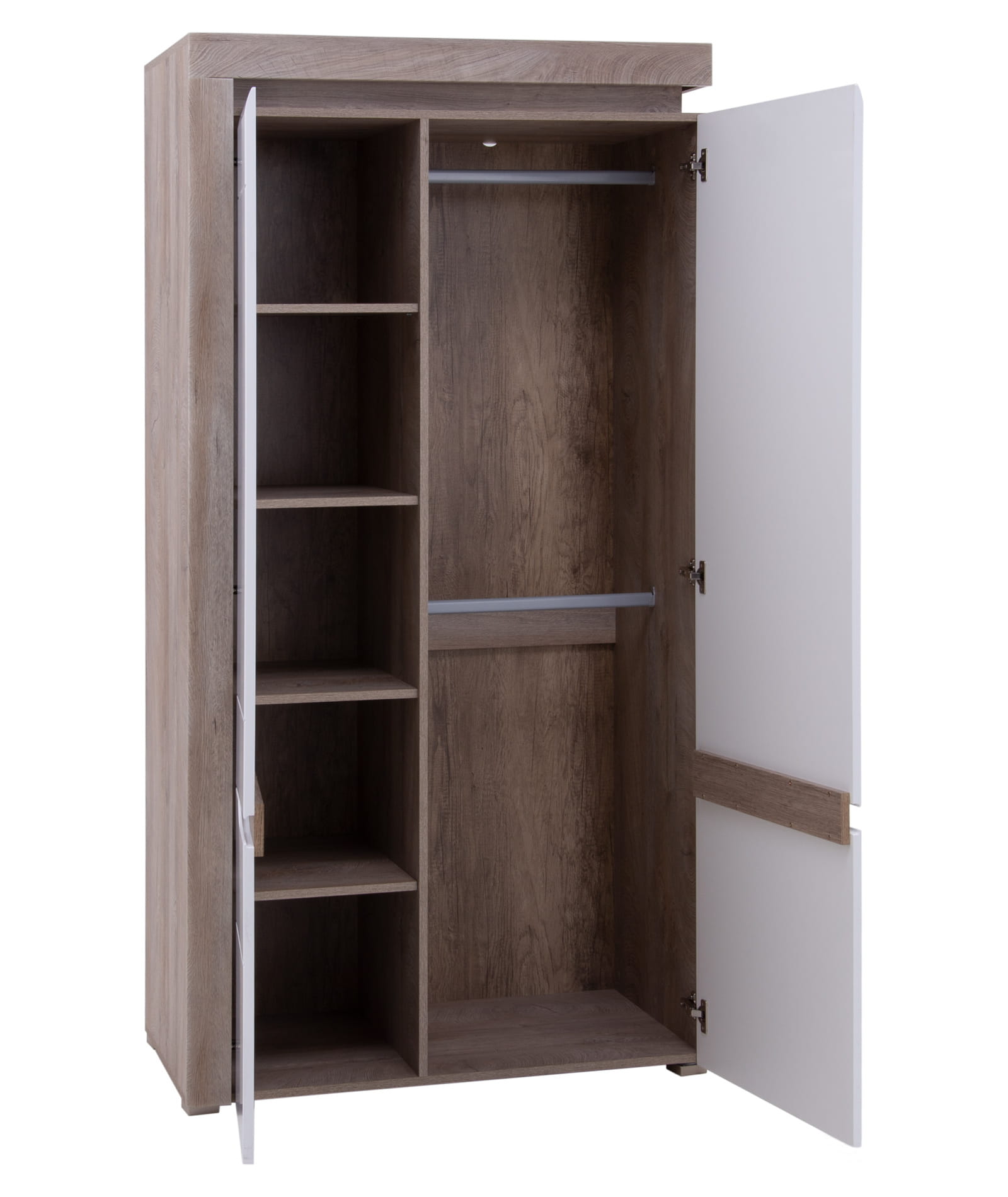 Mebel składa się dwóch otwieranych frontów, za którymi znajdują się dwie komory, jedna dzielona czterema półkami natomiast druga wyposażona w dwa drążki na wieszaki.
