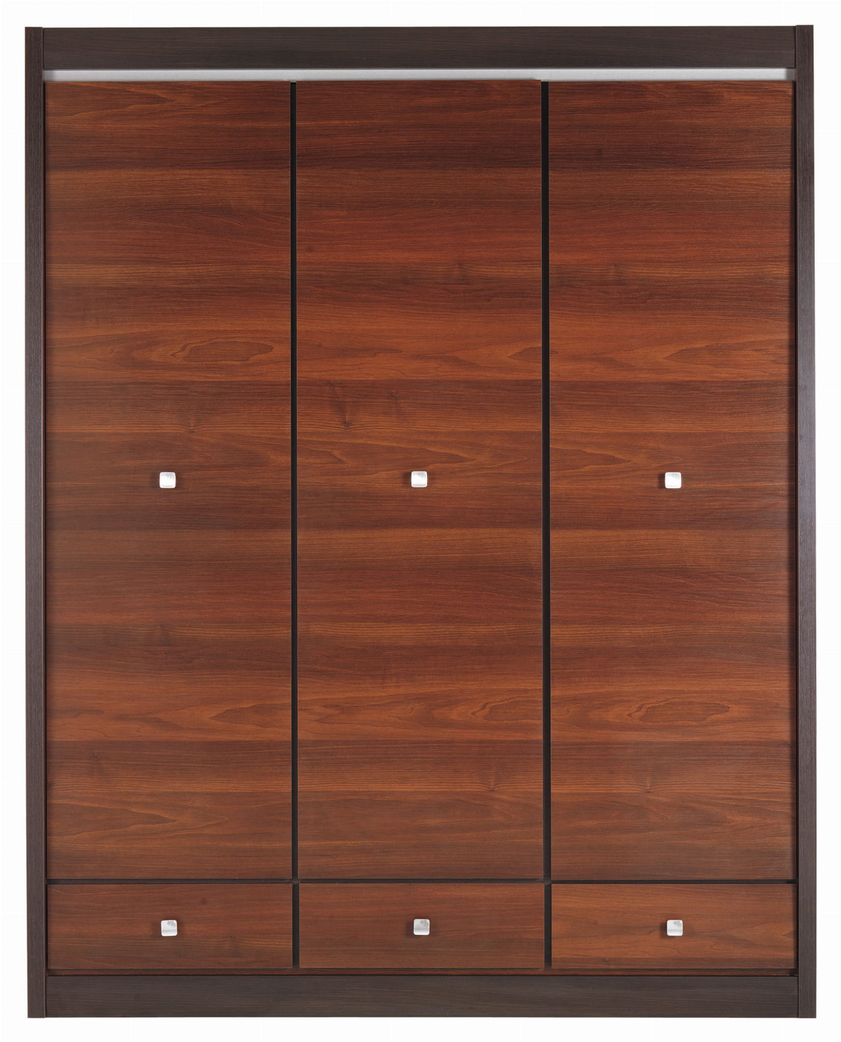 FORREST FR10 charakteryzuje zestawienie dwóch odcieni koloru brązowego ciemnego orzecha z dębem milano, które efektownie ocieplą wnętrze, wprowadzając przy tym przytulną atmosferę. Klasyczny wygląd uzupełnia gustowna połyskująca srebrna listwa oraz delikatne uchwyty z kwiatowym motywem podkreślające swym kształtem całość stylistyki mebla. Na uwagę zasługują również lekko zaokrąglone boki. Jest to świetny wybór dla osób poszukujących połączenia klasy z dużą funkcjonalnością.