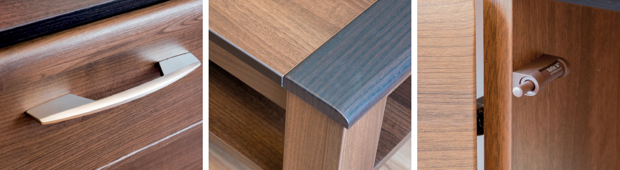 NAOMI NA7 wyróżnia przede wszystkim bardzo popularne wybarwienie na kolor orzecha, który rewelacyjnie współgra z ciemną kolorystyką wenge wstawek. Dodatkowym akcentem zasługującym na uwagę jest zaoblony kształt frontów, co nadaje całości znakomitego efektu stylistycznego.