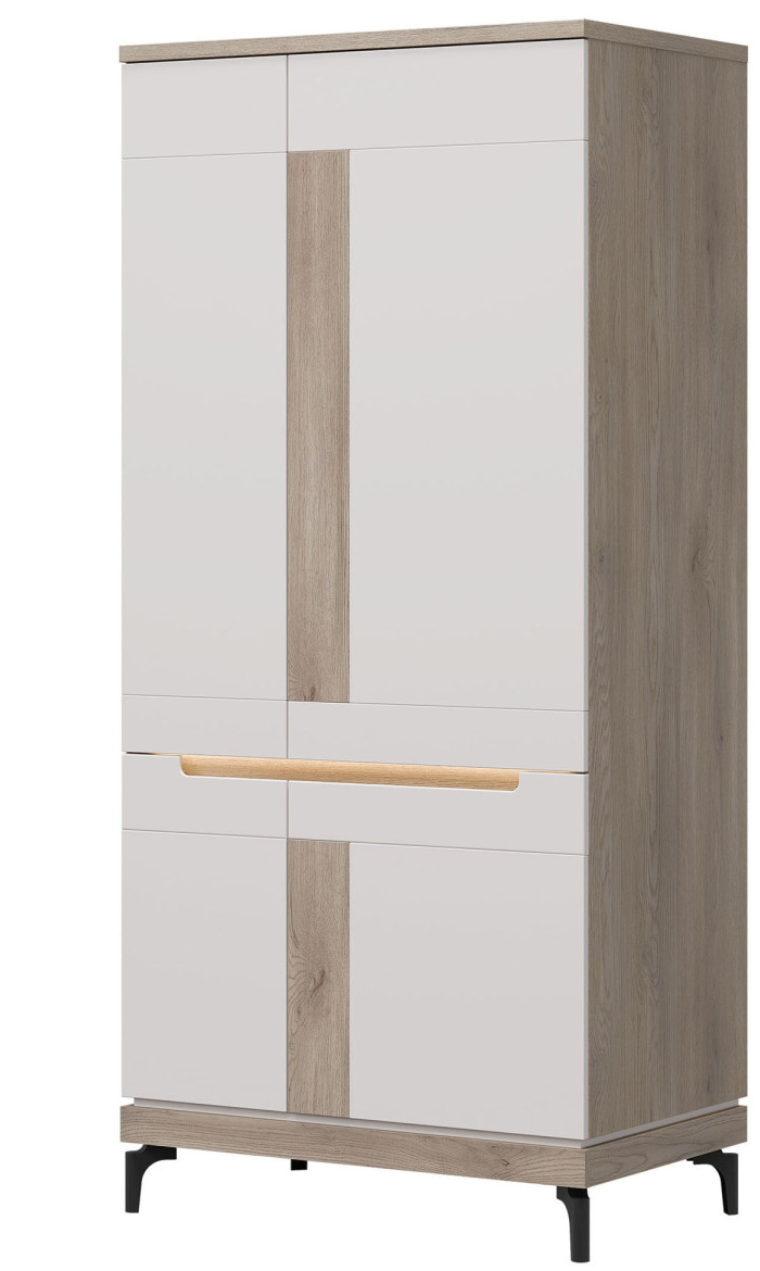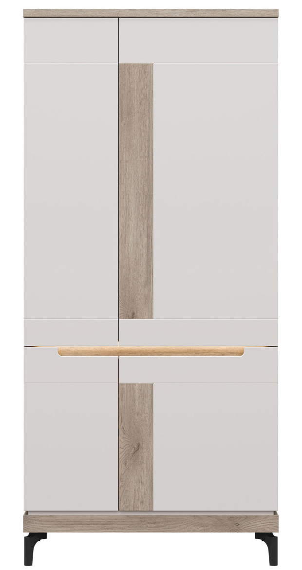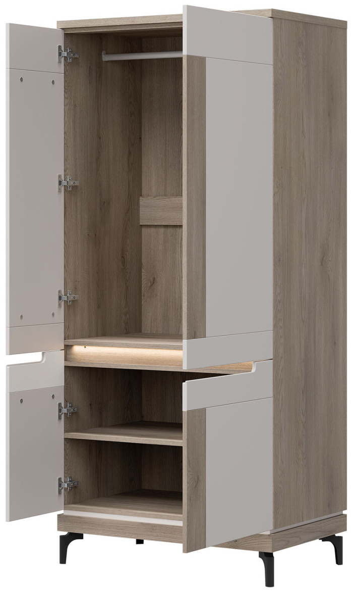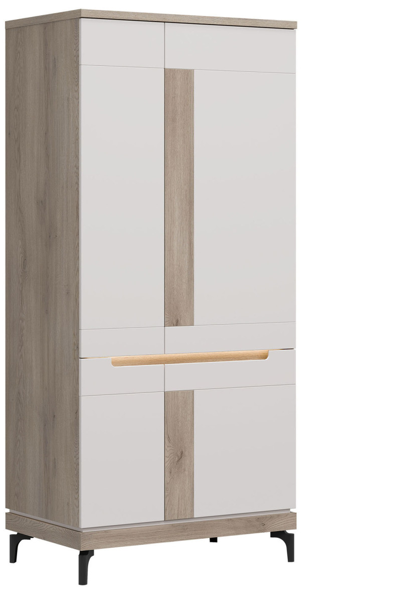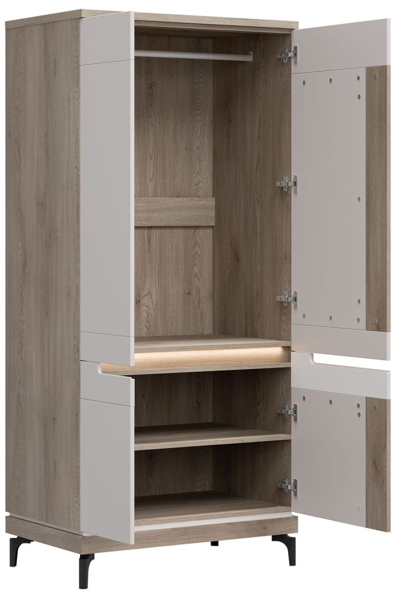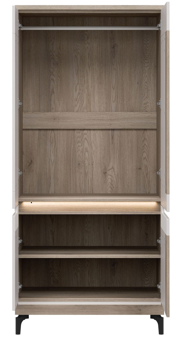 Dzięki przestronnemu wnętrzu oraz eleganckiej konstrukcji szafa Aston AN11 zapewnia wygodne i stylowe przechowywanie najważniejszych części garderoby. Mebel wyposażony jest w czworo drzwiczek, za którymi znajduje się drążek na wieszaki oraz dwie wnęki – gdzie możesz schować poskładane ubrania, sezonowe buty czy pudełka z akcesoriami.