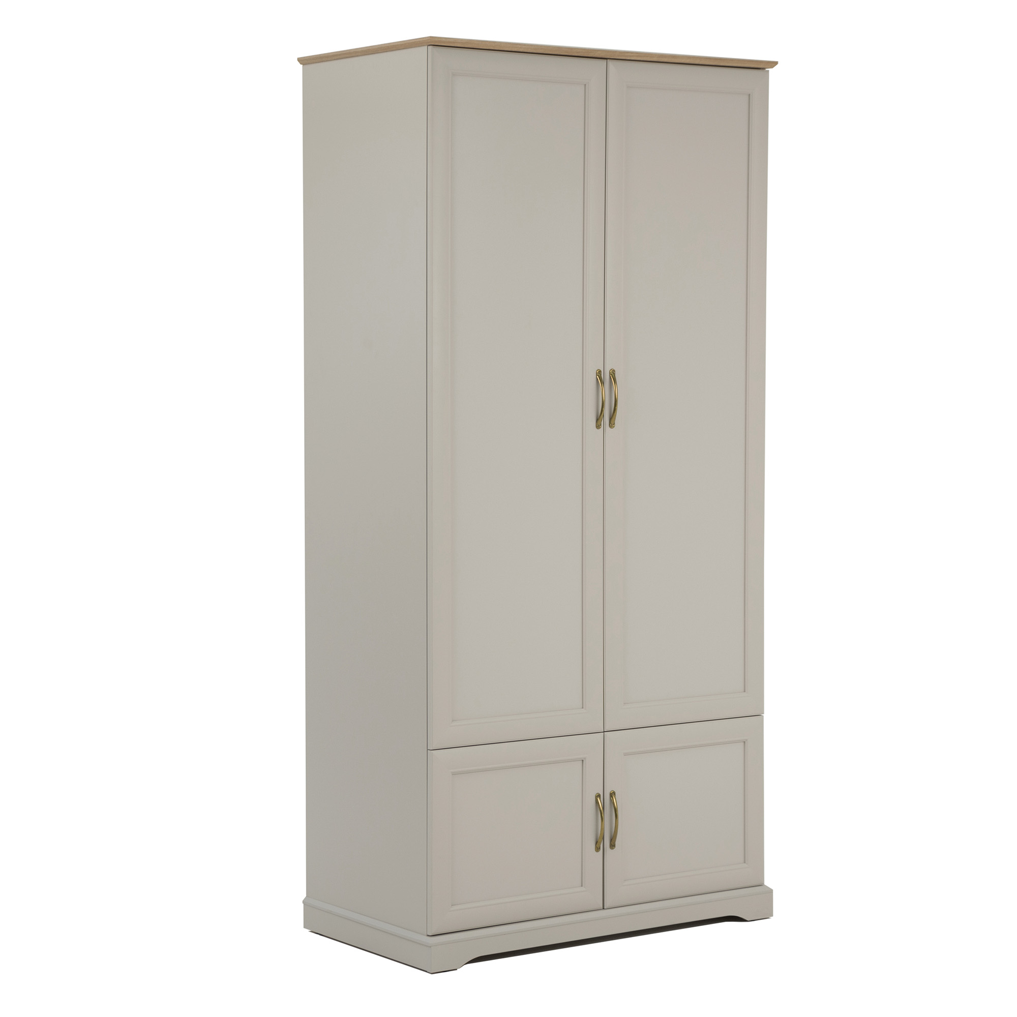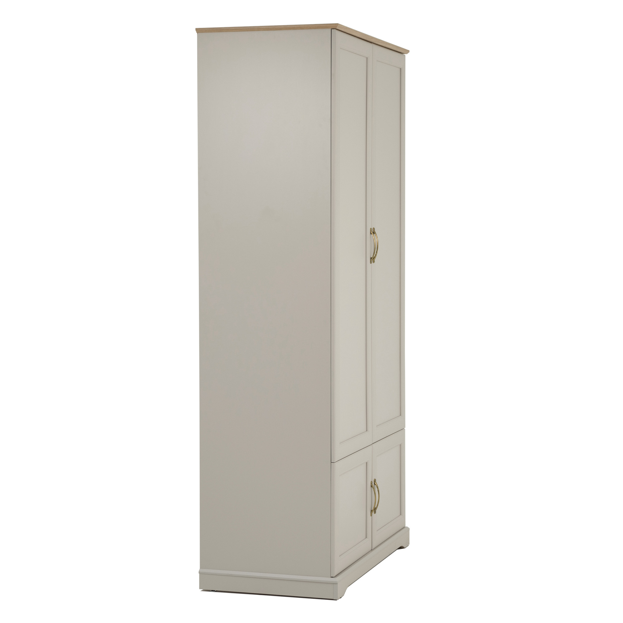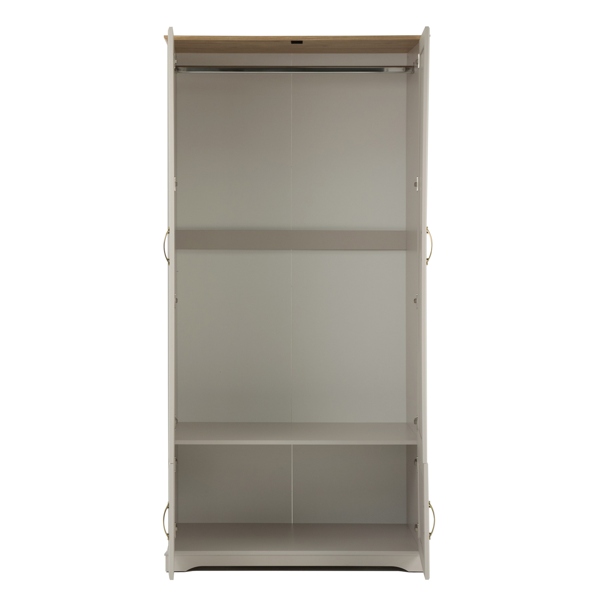 Czterodrzwiowy mebel wyposażony jest w komorę z drążkiem na wieszaki, pod którą znajduje się zamykana szafka. Otwierany jest za pomocą wygodnych metalowych uchwytów.