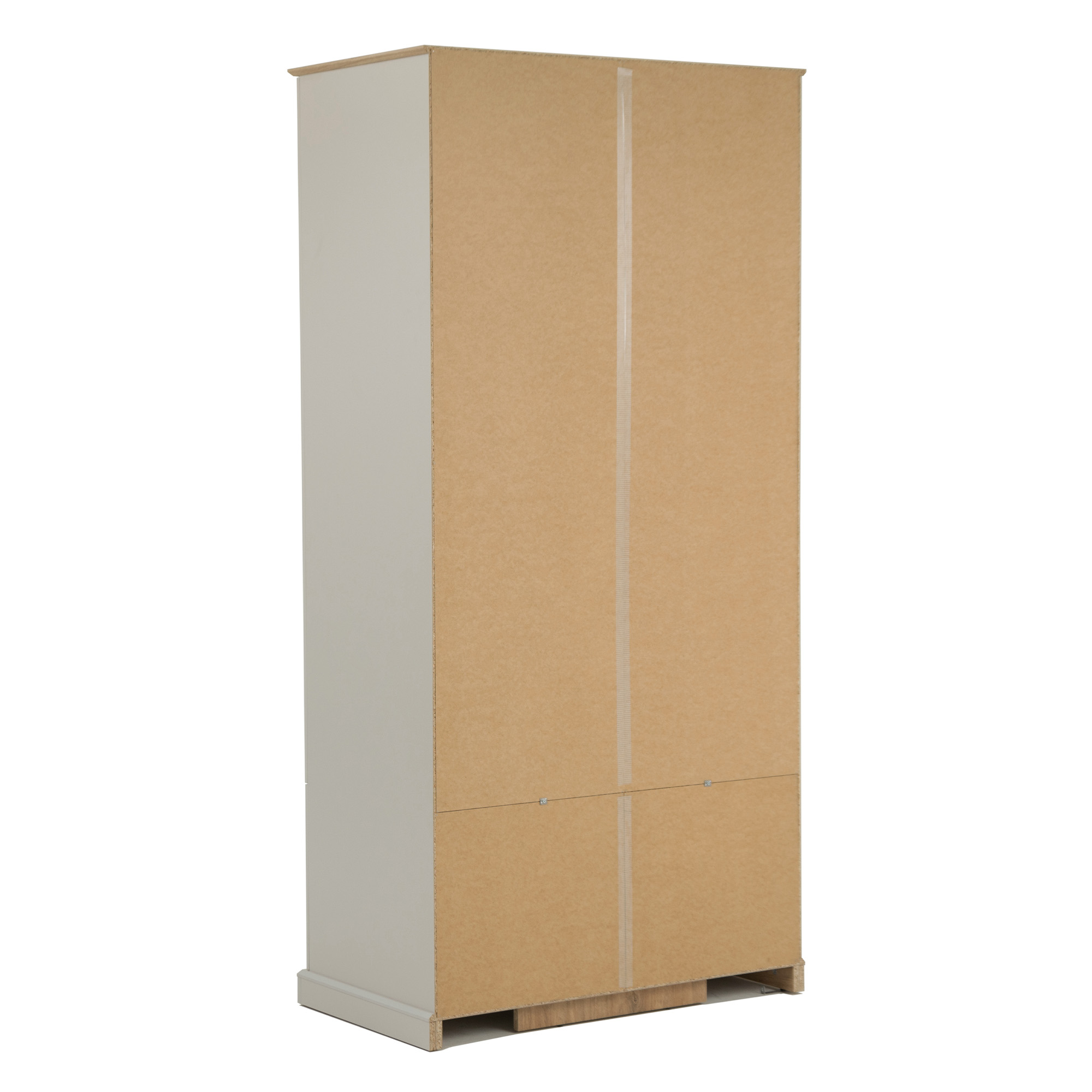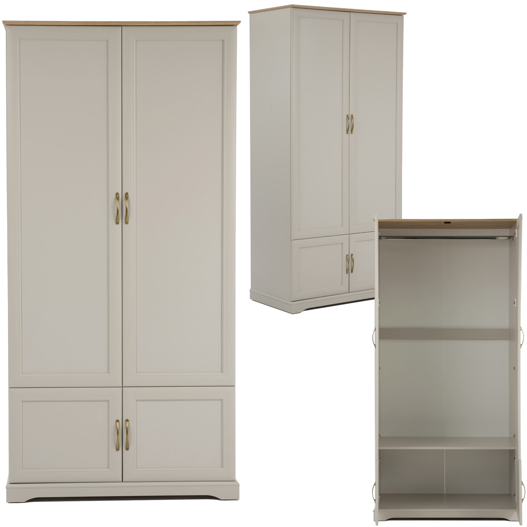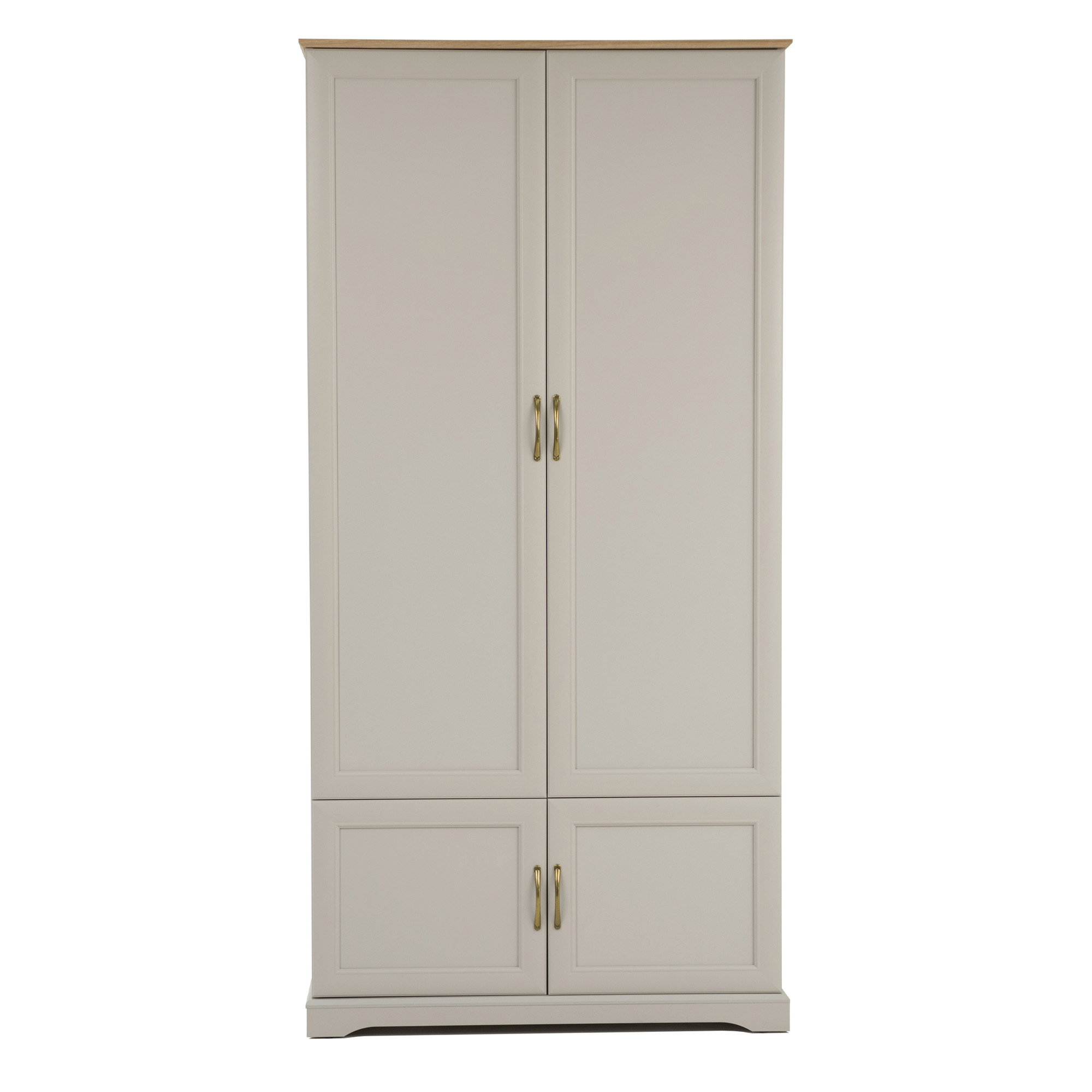 Czterodrzwiowy mebel wyposażony jest w komorę z drążkiem na wieszaki, pod którą znajduje się zamykana szafka. Otwierany jest za pomocą wygodnych metalowych uchwytów.