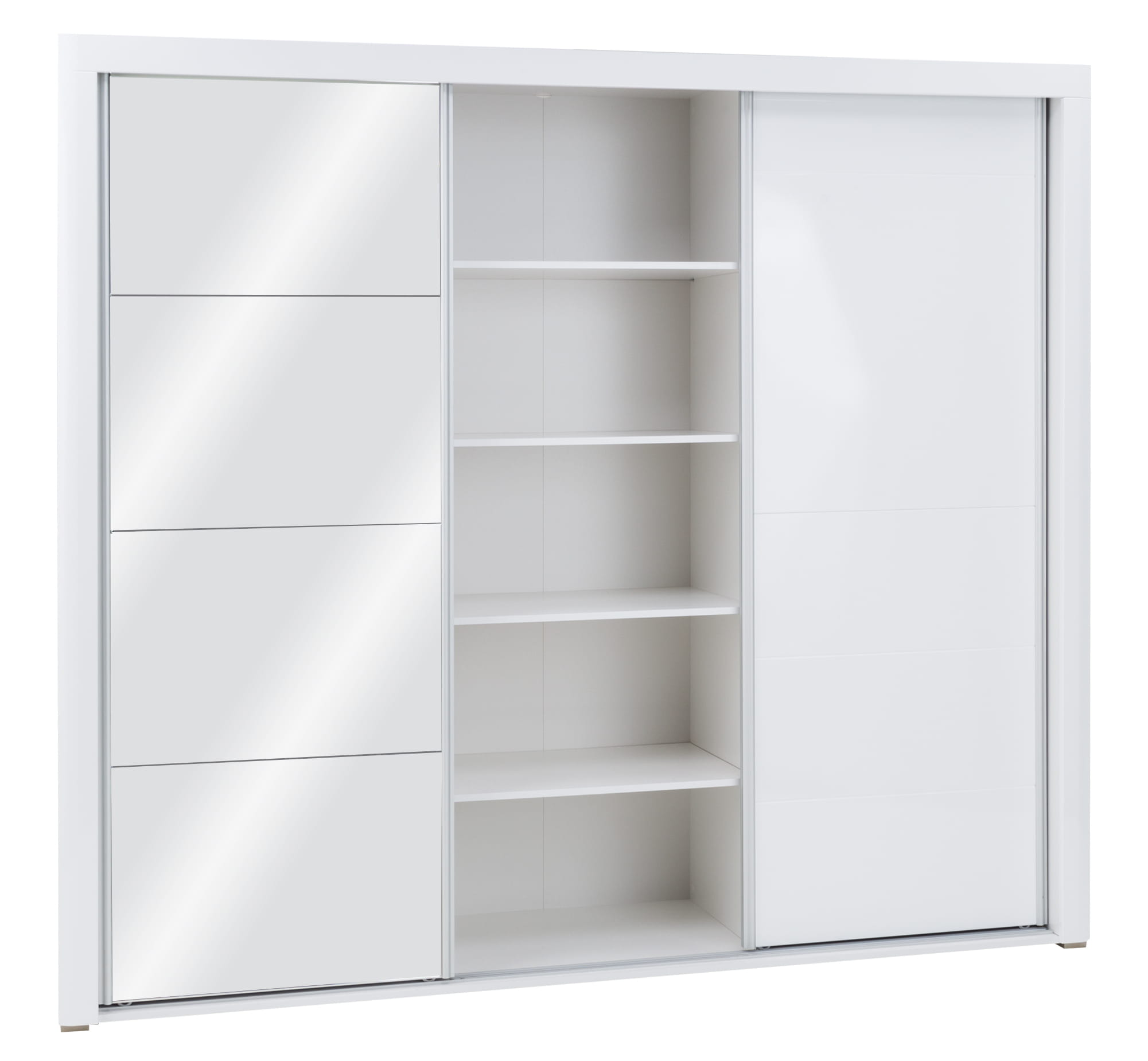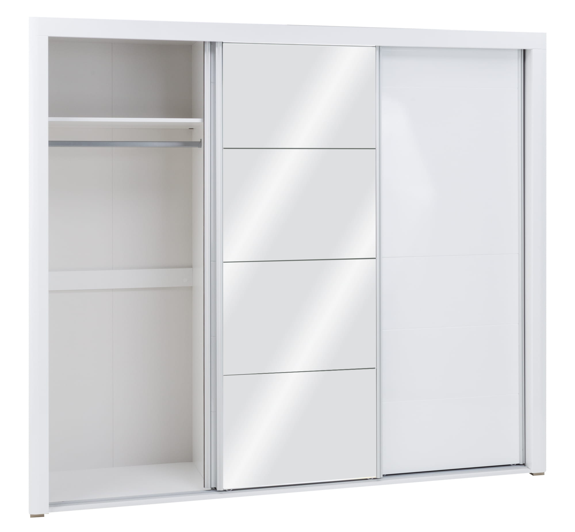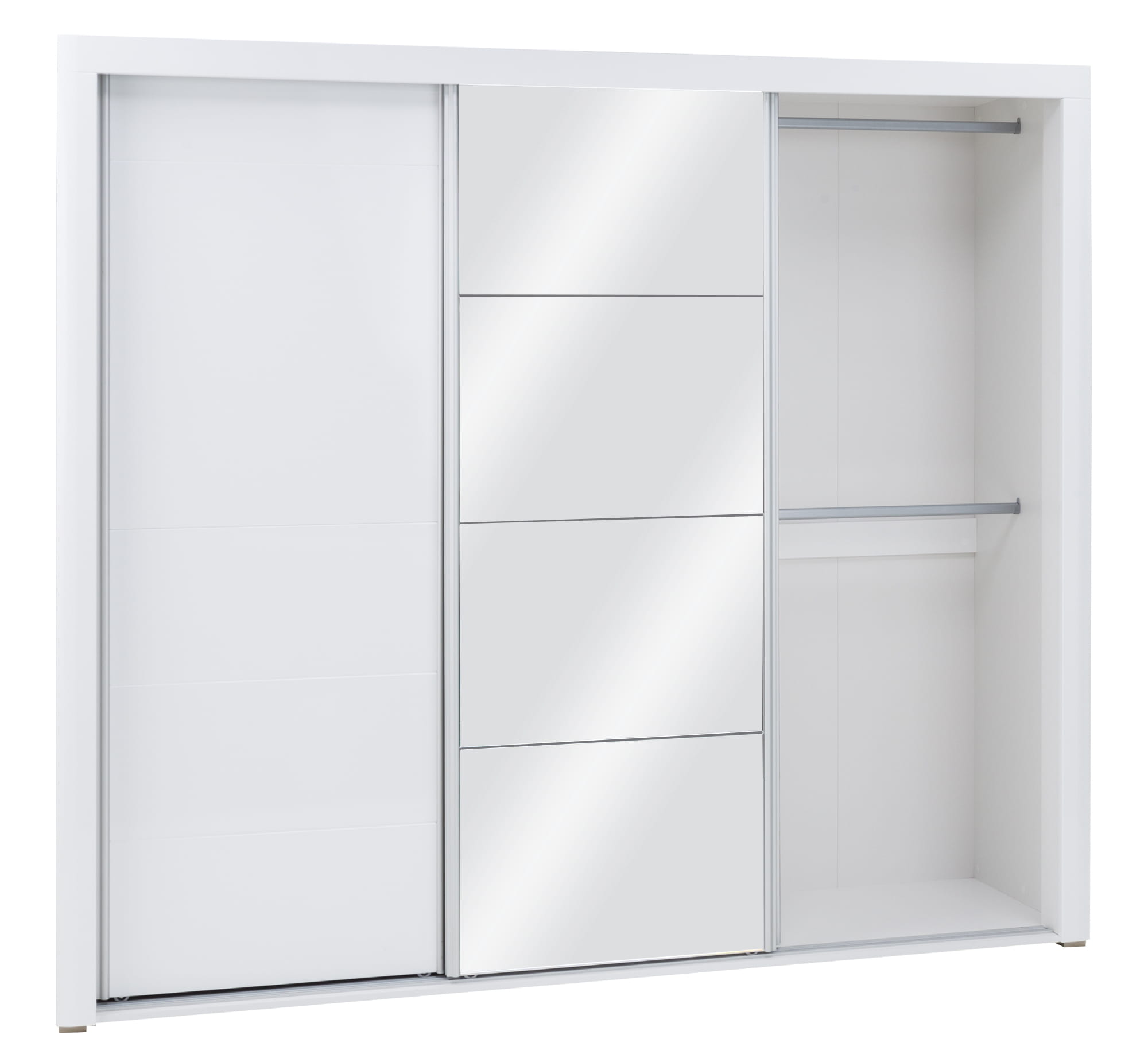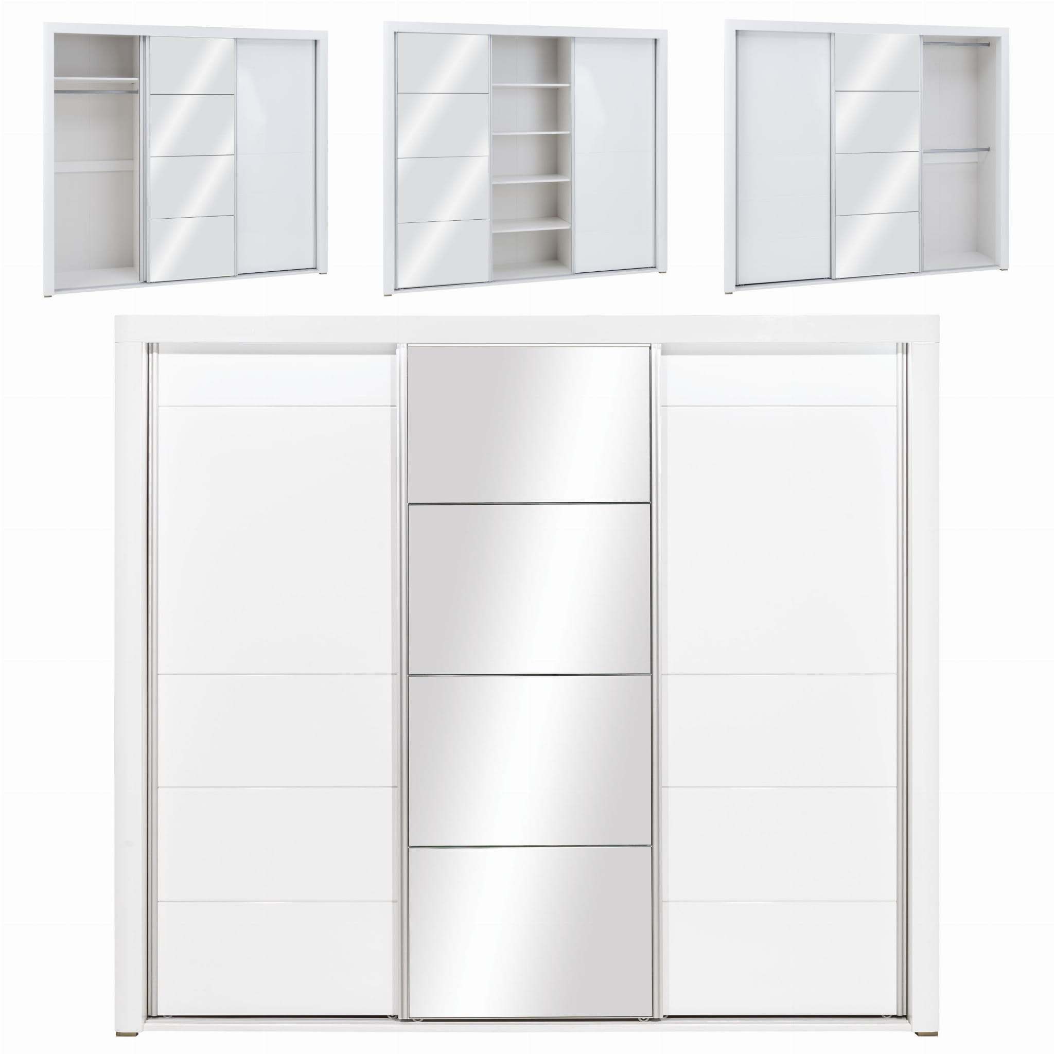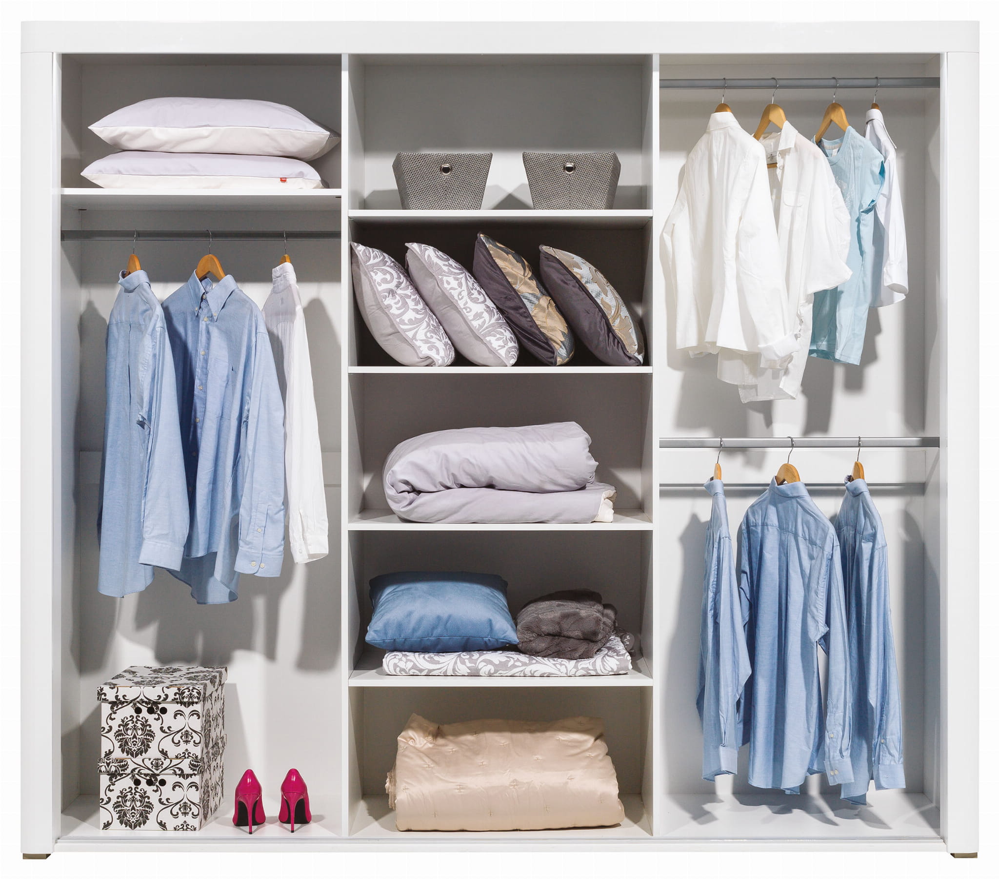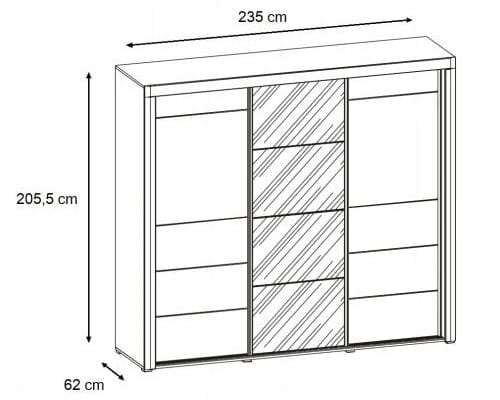 Mebel składa się trzech przesuwnych frontów, za którymi znajdują się trzy komory, środkowa jest dzielona czterema półkami, natomiast pozostałe wyposażono w trzy drążki na wieszaki oraz dodatkową półkę.