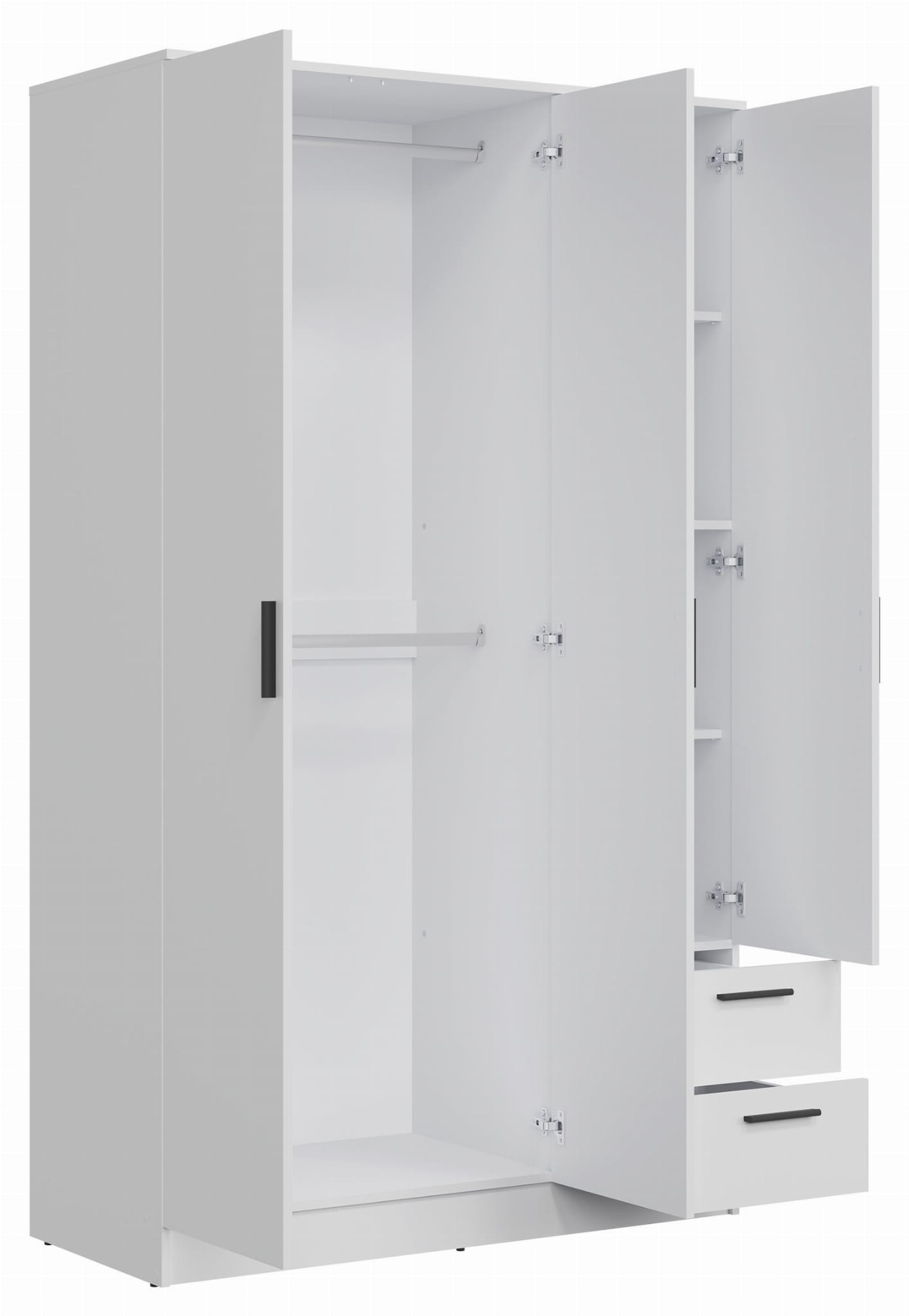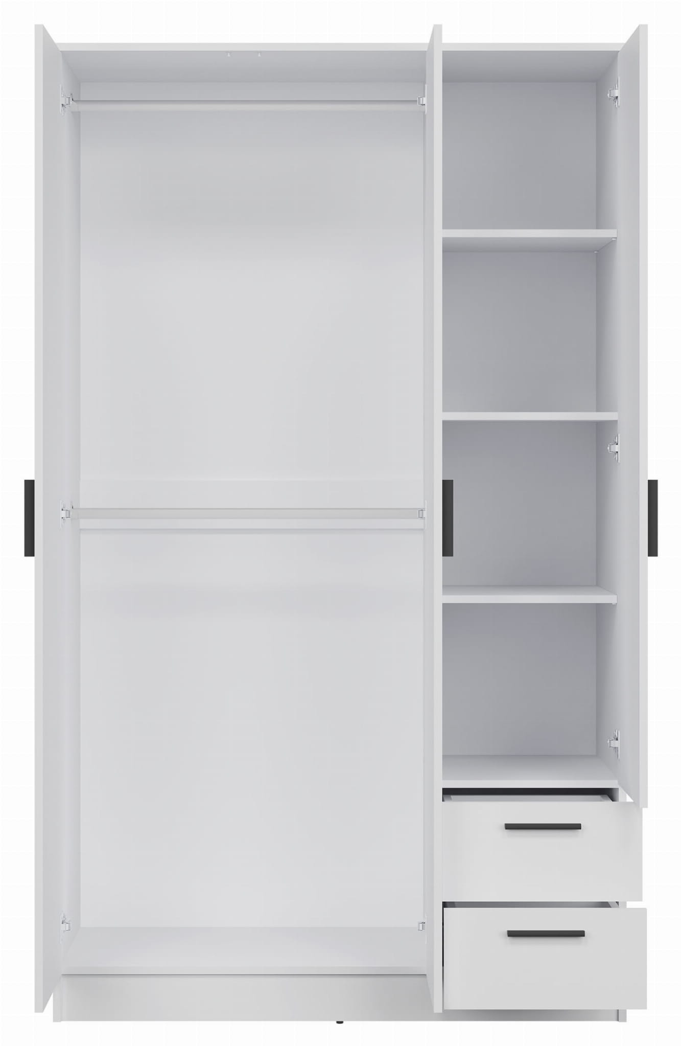 Trzydrzwiowa szafa kryje we wnętrzu dwa drążki, które pozwolą uzyskać wygodny dostęp do poszczególnych części twojej garderoby. W prawej części znajdują się cztery wnęki, w których możesz trzymać złożone ubrania. Dwie szuflady to idealne miejsce na drobne akcesoria.
