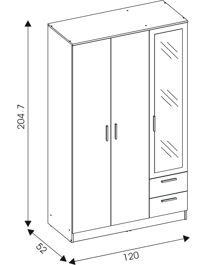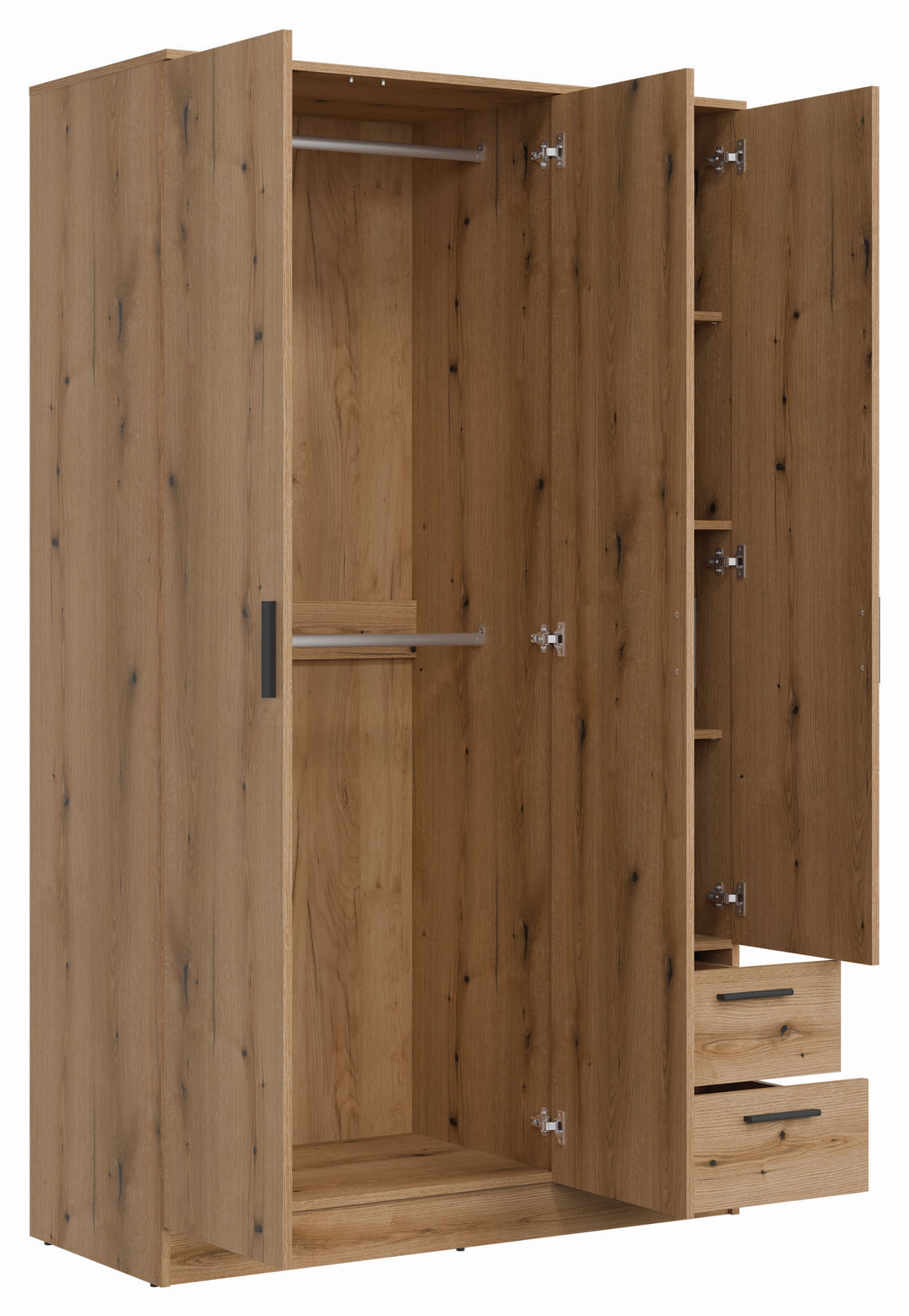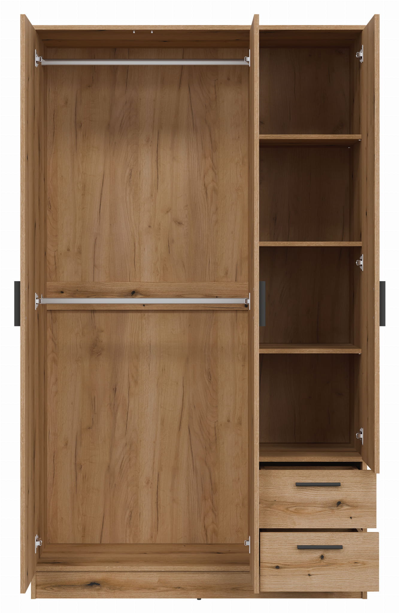 Trzydrzwiowa szafa kryje we wnętrzu dwa drążki, które pozwolą uzyskać wygodny dostęp do poszczególnych części twojej garderoby. W prawej części znajdują się cztery wnęki, w których możesz trzymać złożone ubrania. Dwie szuflady to idealne miejsce na drobne akcesoria.