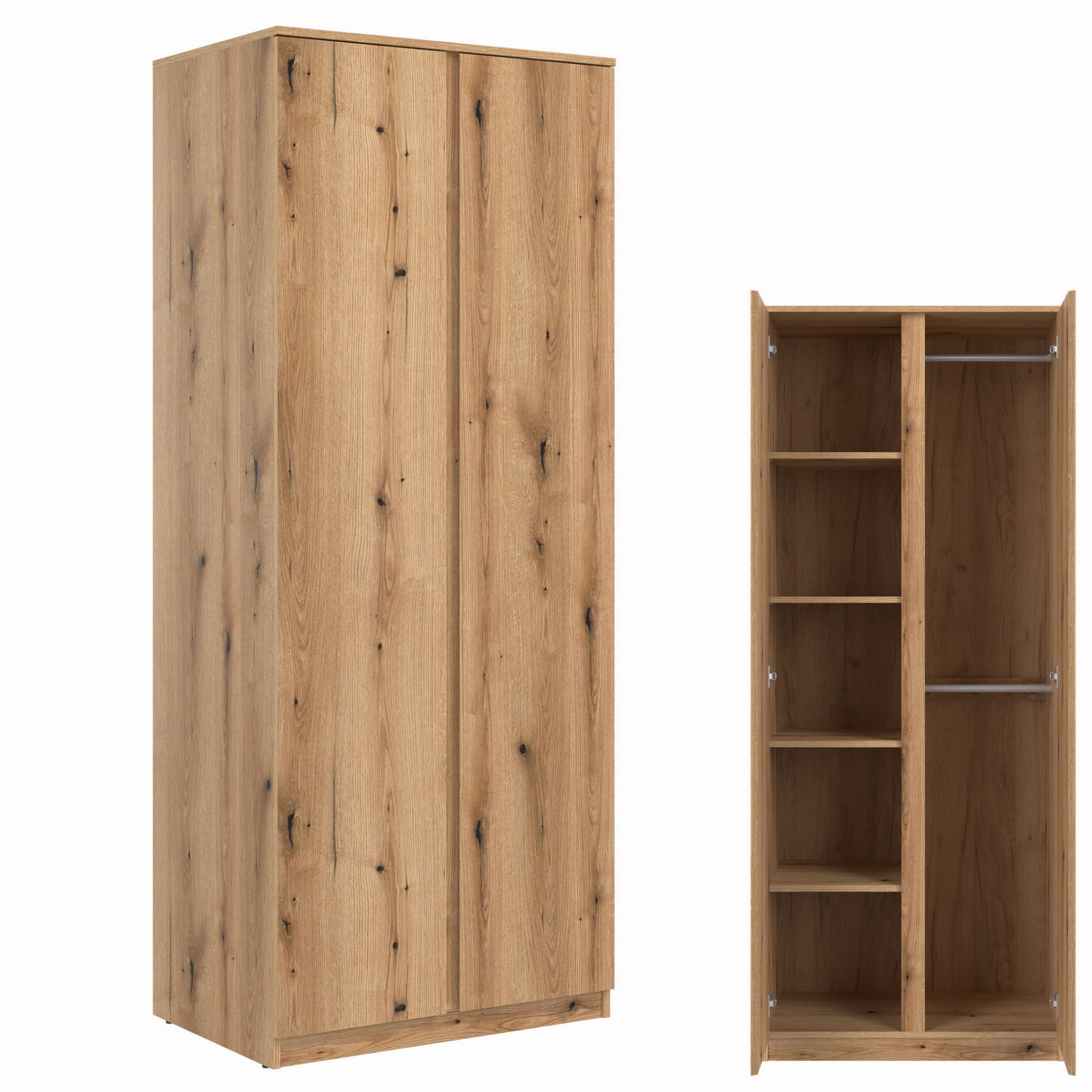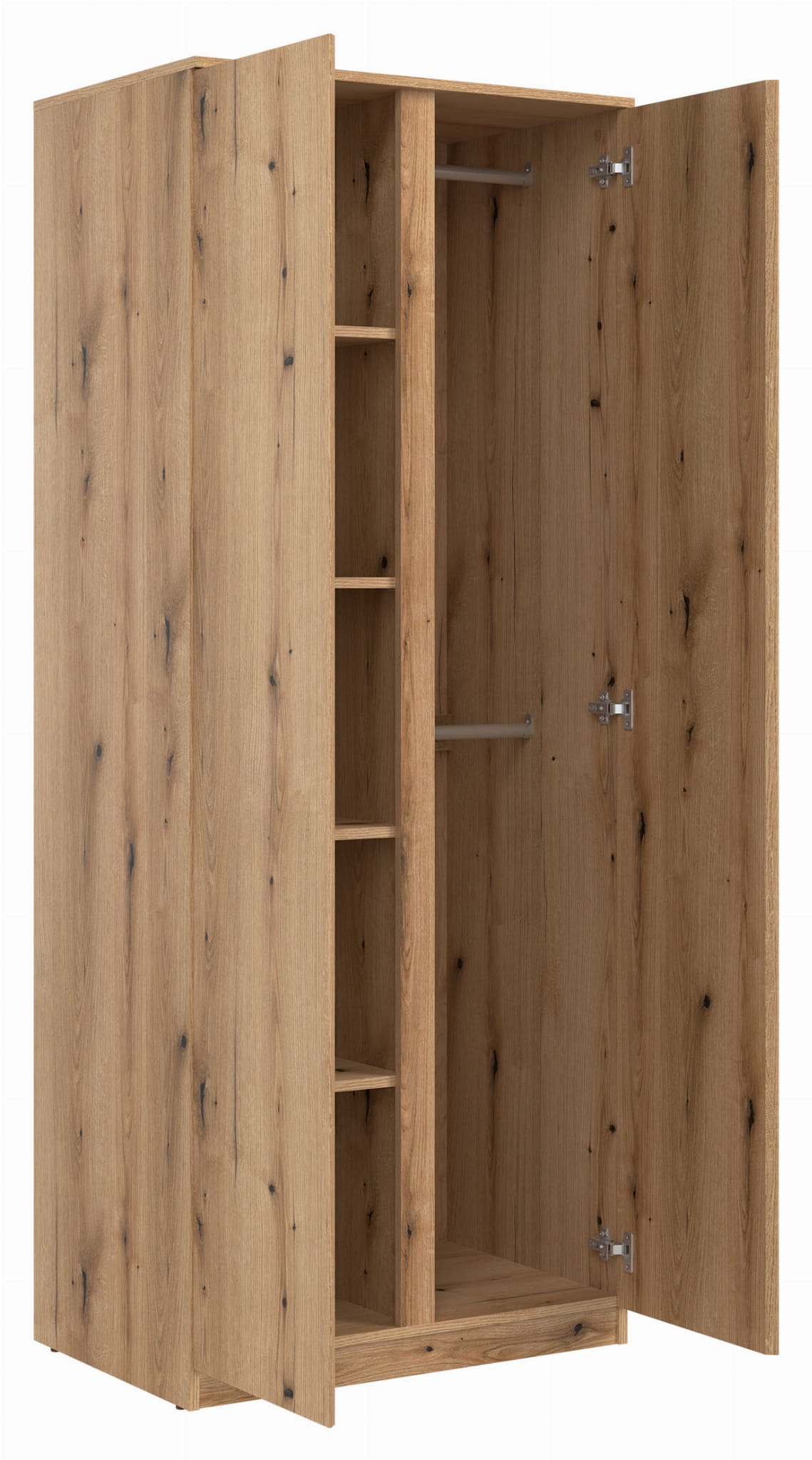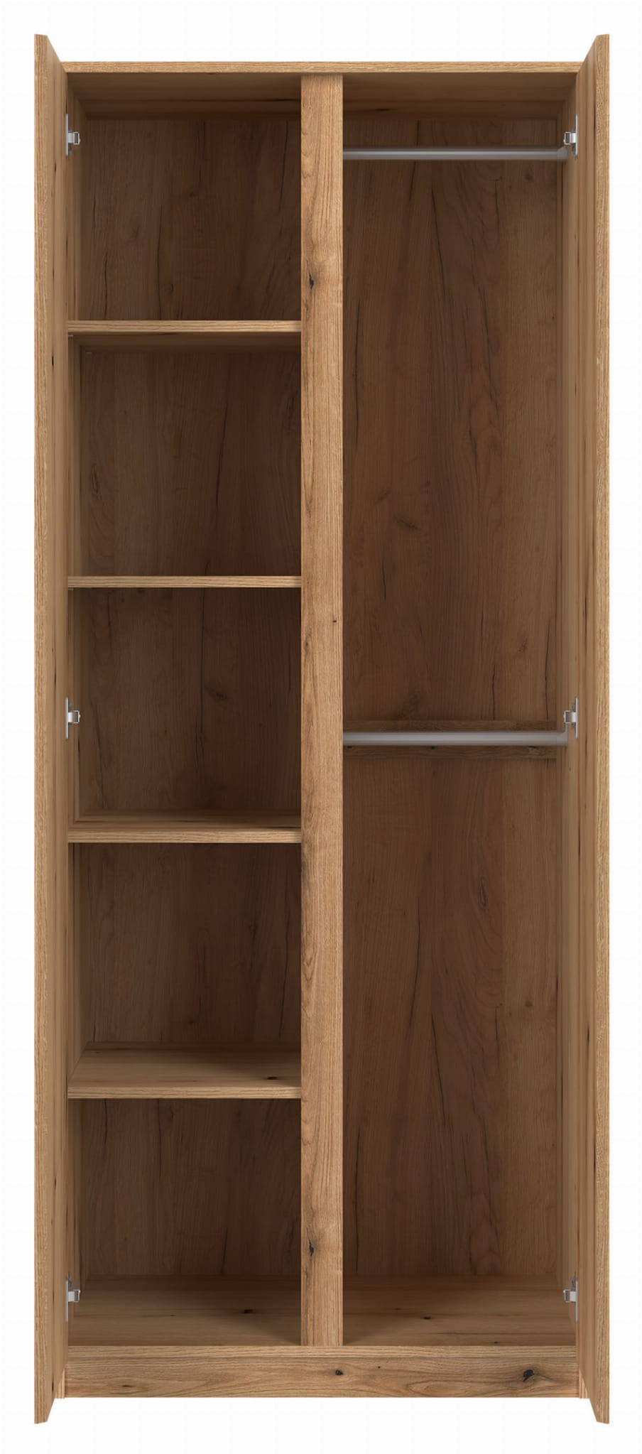 Dwudrzwiową szafę podzielono symetrycznie na dwie części, które wyposażono w dwa drążki na wieszaki po stronie prawej oraz pięć wnęk po stronie lewej.