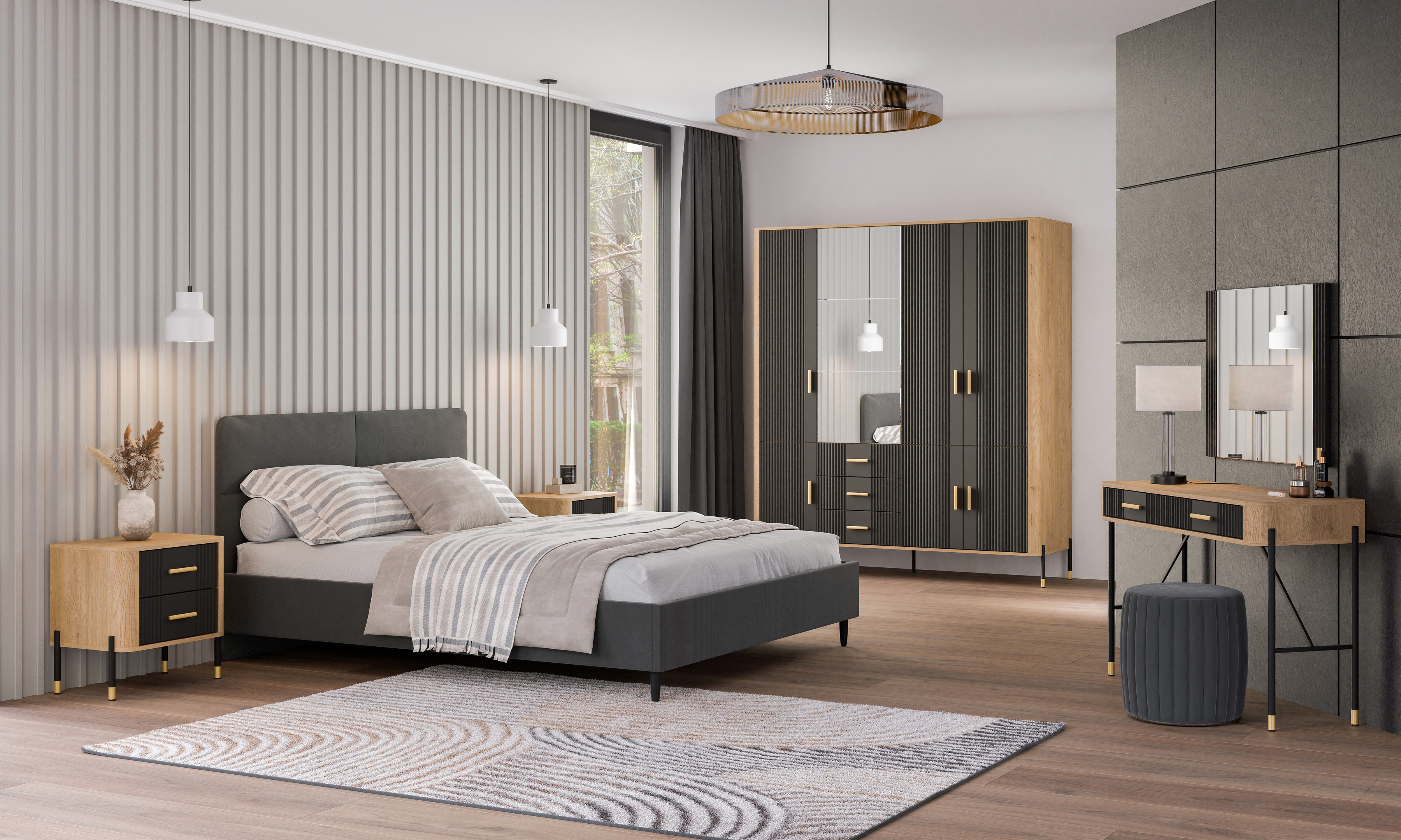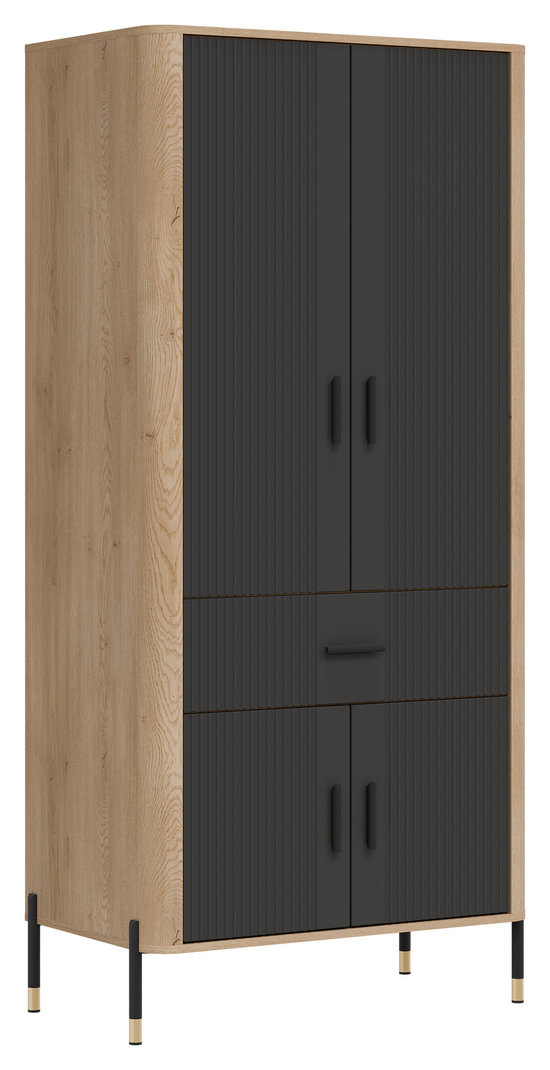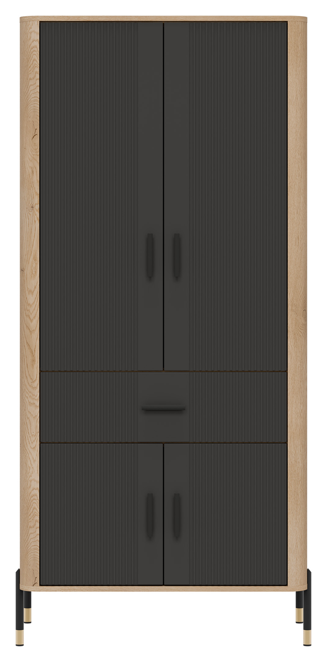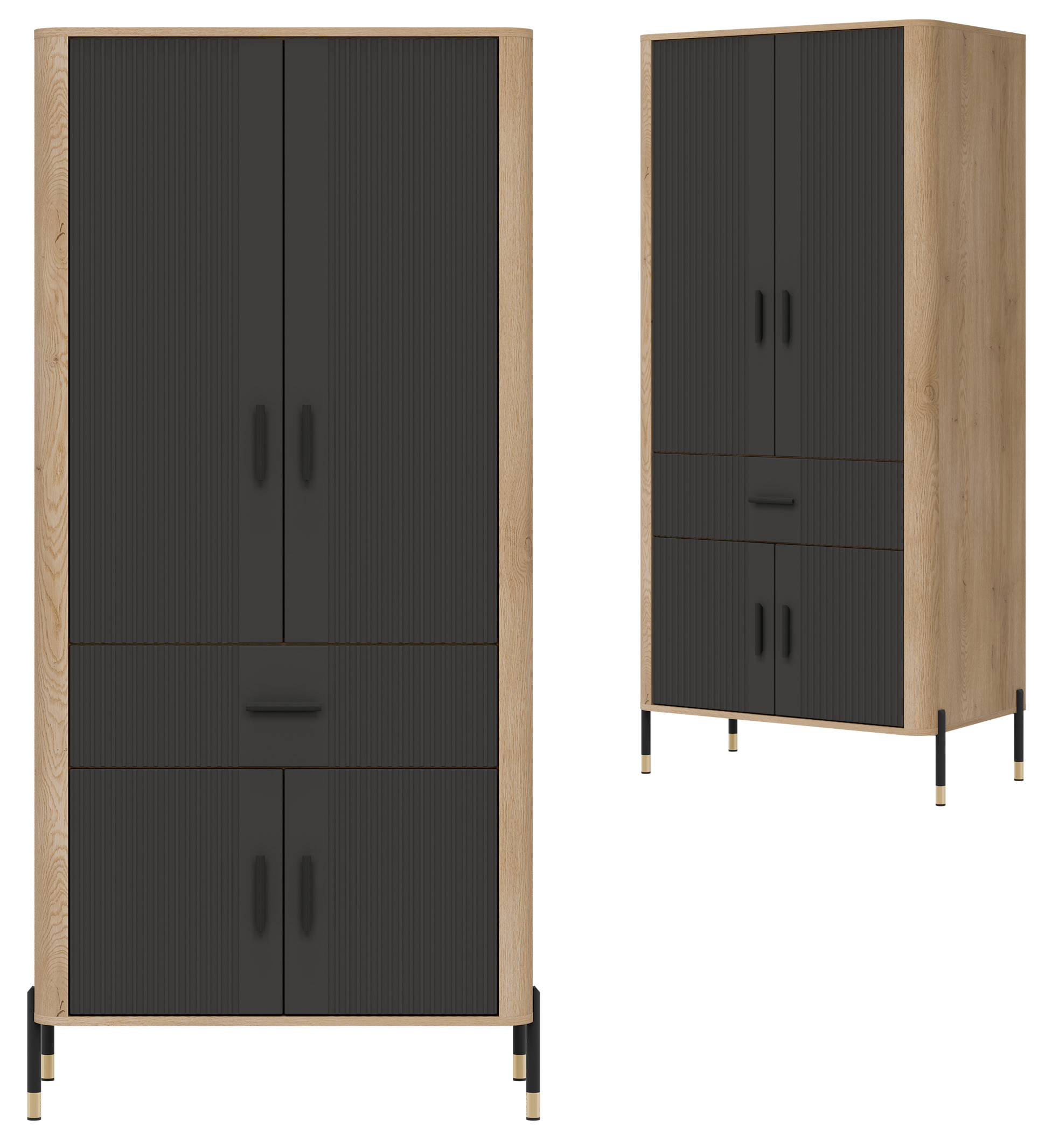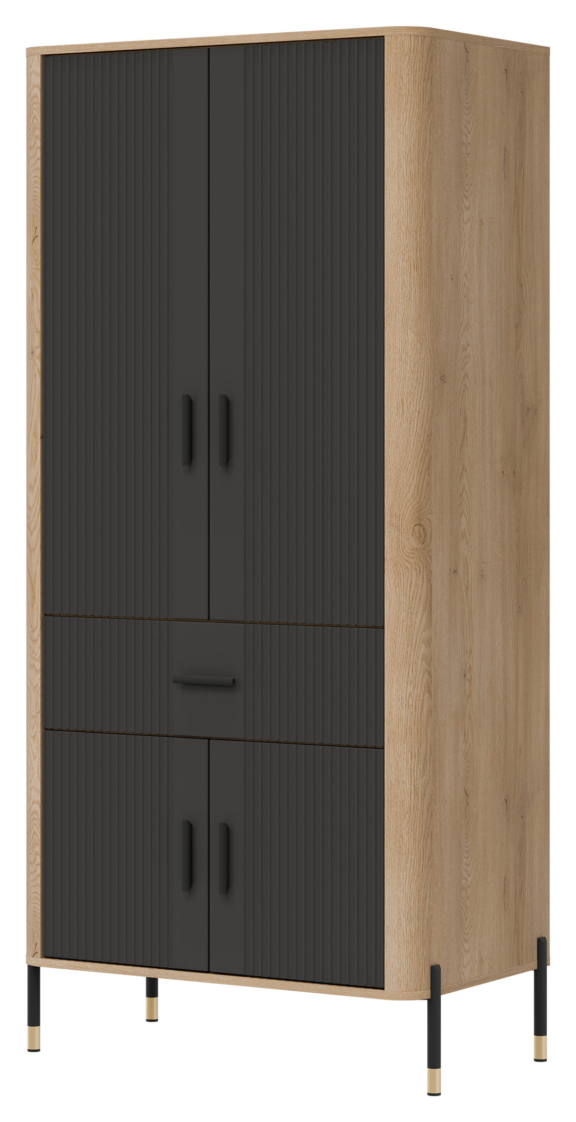 Fronty mebla w antracytowej kolorystyce o matowej strukturze, nadają mu szlachetności i nowoczesnego charakteru, podczas gdy korpus w dekorze naturalnego dębu cremona torro ociepla całość, wprowadzając przytulność i styl. Solidna, smukła bryła szafy osadzona została na lekkich, metalowych nóżkach z eleganckimi złotymi zakończeniami, co nadaje konstrukcji lekkości i pozwala łatwo utrzymać czystość pod meblem. Całości dopełniają czarne, pionowe uchwyty, które są zarówno ozdobne, jak i ergonomiczne.