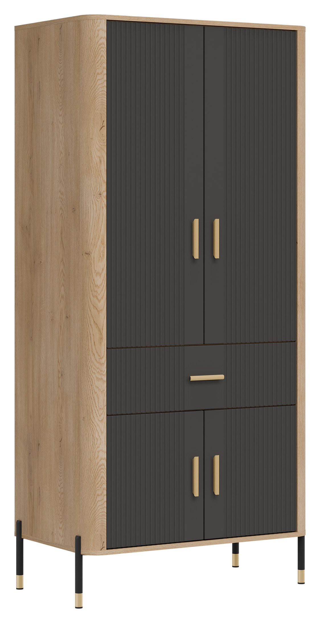 Fronty mebla w antracytowej kolorystyce o matowej strukturze, nadają mu szlachetności i nowoczesnego charakteru, podczas gdy korpus w dekorze naturalnego dębu cremona torro ociepla całość, wprowadzając przytulność i styl. Solidna, smukła bryła szafy osadzona została na lekkich, metalowych nóżkach z eleganckimi złotymi zakończeniami, co nadaje konstrukcji lekkości i pozwala łatwo utrzymać czystość pod meblem. Całości dopełniają złote, pionowe uchwyty, które są zarówno ozdobne, jak i ergonomiczne.
