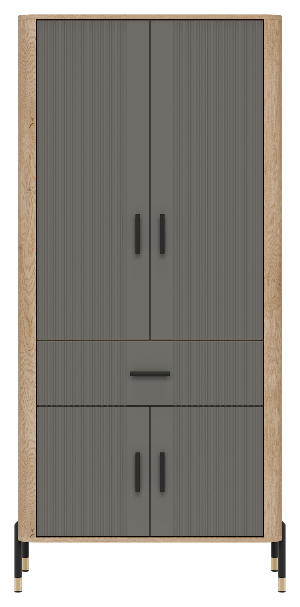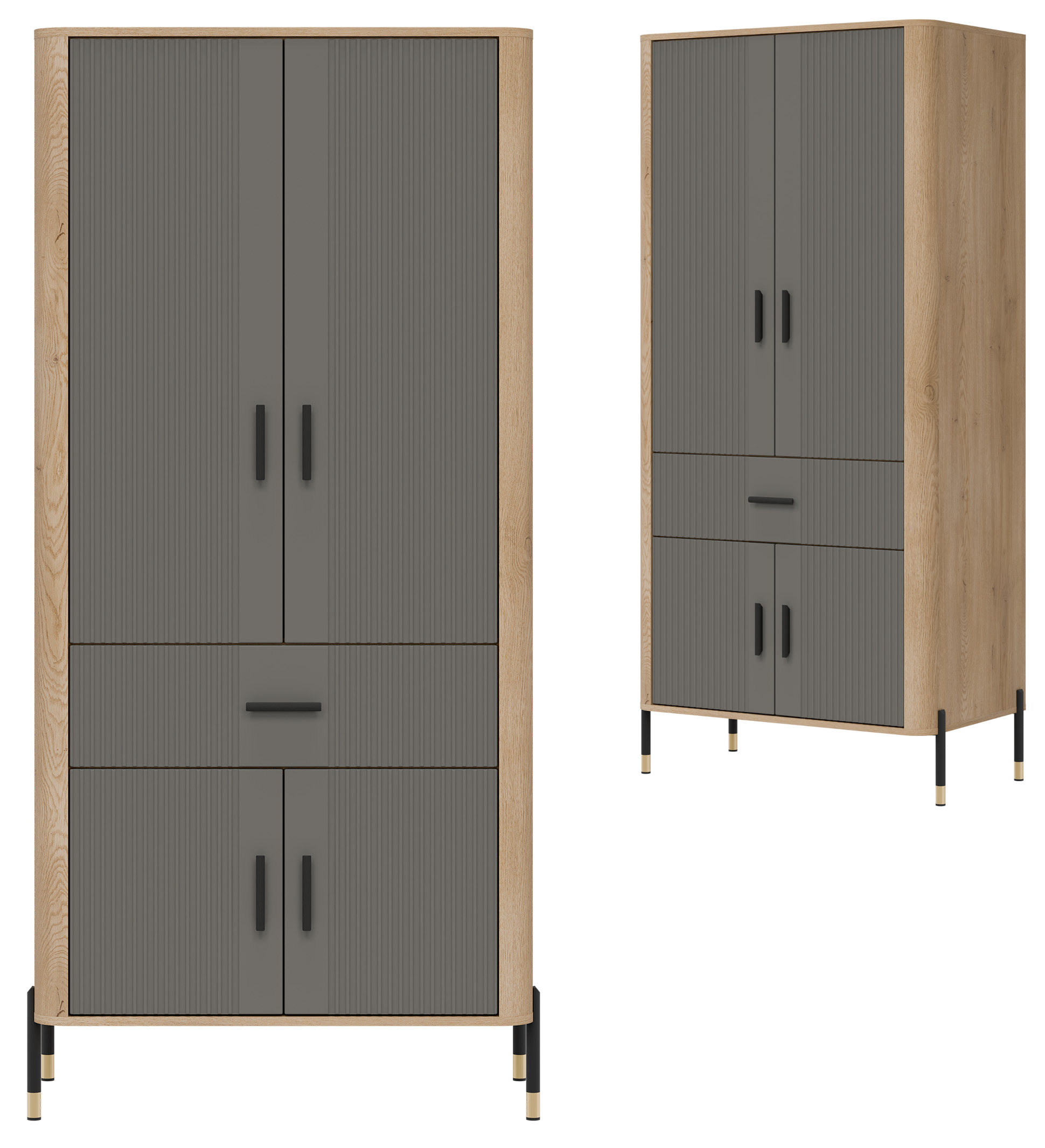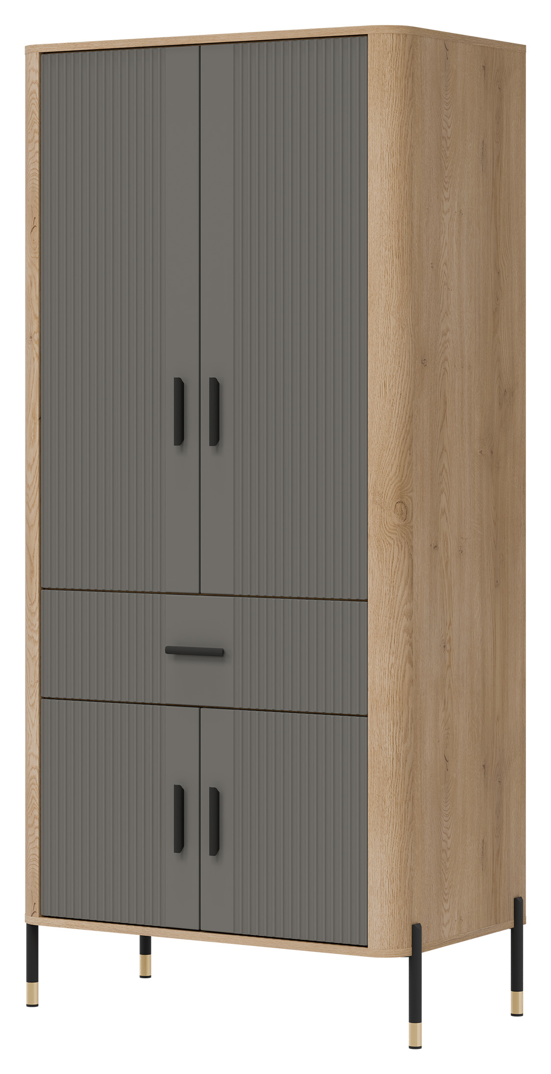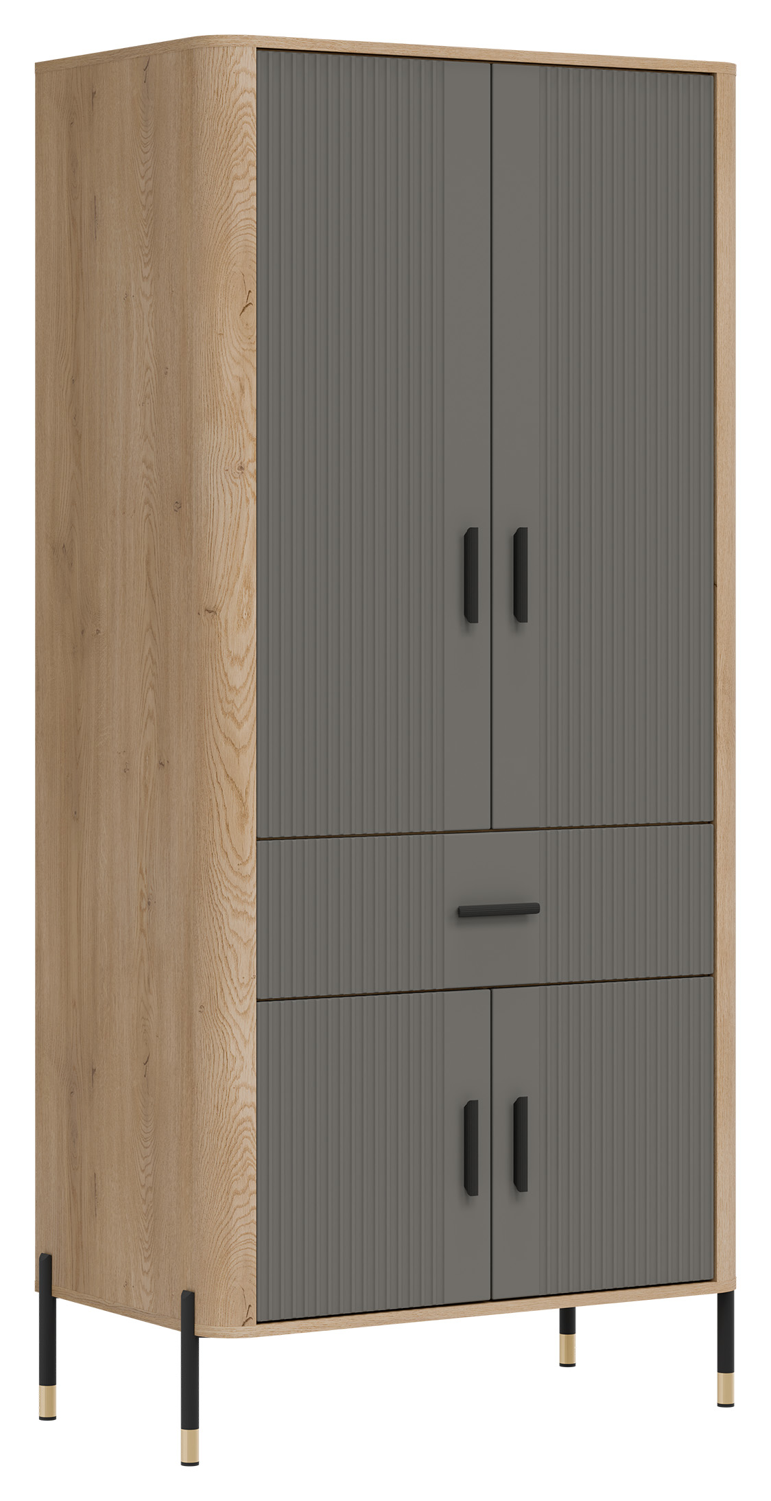 Fronty mebla w szarej kolorystyce o matowej strukturze, nadają mu szlachetności i nowoczesnego charakteru, podczas gdy korpus w dekorze naturalnego dębu cremona torro ociepla całość, wprowadzając przytulność i styl. Solidna, smukła bryła szafy osadzona została na lekkich, metalowych nóżkach z eleganckimi złotymi zakończeniami, co nadaje konstrukcji lekkości i pozwala łatwo utrzymać czystość pod meblem. Całości dopełniają czarne, pionowe uchwyty, które są zarówno ozdobne, jak i ergonomiczne.