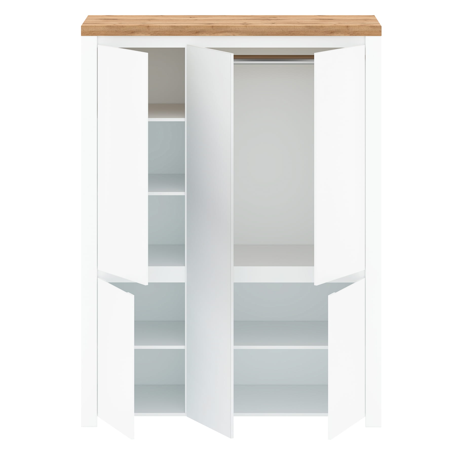 Meblem niezbędnym w sypialni, pokoju młodzieżowym, dziecięcym lub w garderobie jest duża, pojemna szafa, która pomieści wiele niezbędnych rzeczy przede wszystkim ubrań i dodatków. Szafa z kolekcji VIGO oprócz dużej przestrzeni przeznaczonej na wiszące ubrania posiada również dodatkowe półki zamknięte białymi frontami oraz lustro. Biały mebel z blatem górnym w kolorze dębu wotan świetnie sprawdzi się także jako niezależny dodatek do innych kolekcji. Kolekcja mebli VIGO usatysfakcjonuje każdego wielbiciela nienagannej prostoty w nowoczesnej odsłonie.