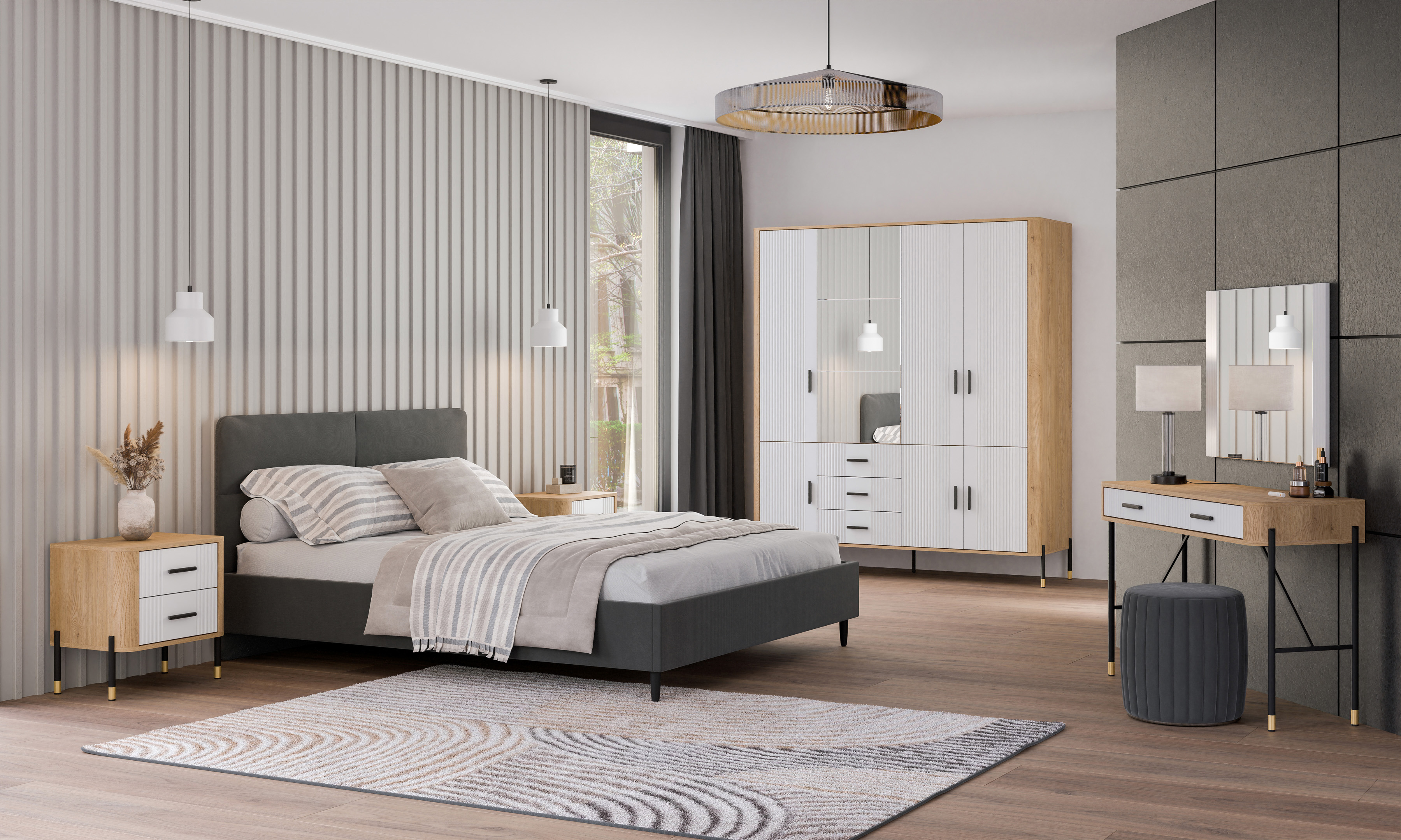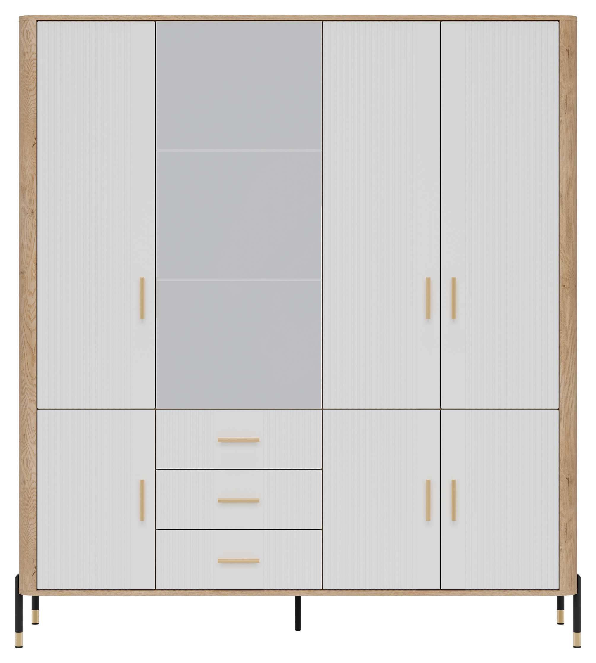 Szafa DT17 z kolekcji DANTE to mebel, który nie tylko przyciąga wzrok eleganckim designem, ale także imponuje swoją funkcjonalnością. Ta przestronna szafa to idealna propozycja dla osób ceniących wysoką jakość wykonania, przemyślaną organizację przestrzeni oraz nowoczesne wzornictwo. Centralną część bryły zajmuje czworo dużych drzwi, które dają doskonały dostęp do praktycznych i pojemnych wnętrz. Drzwi z dużym lustrem nadają meblowi lekkości i elegancji. W dolnej części mebla znajdują się cztery praktyczne szuflady, które ułatwiają organizację drobnych akcesoriów.