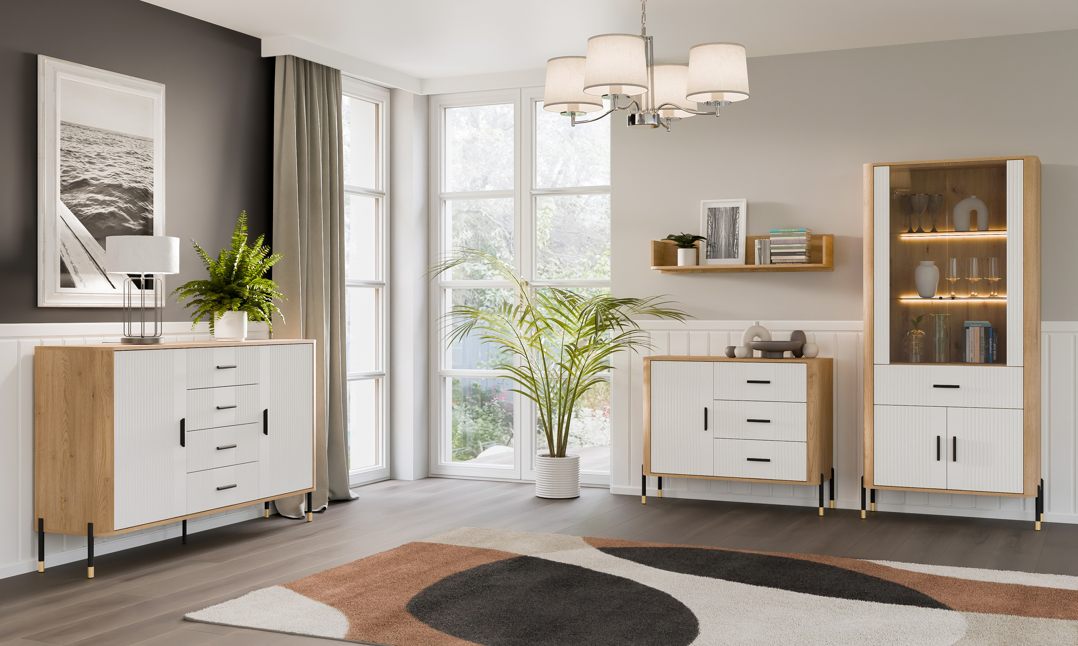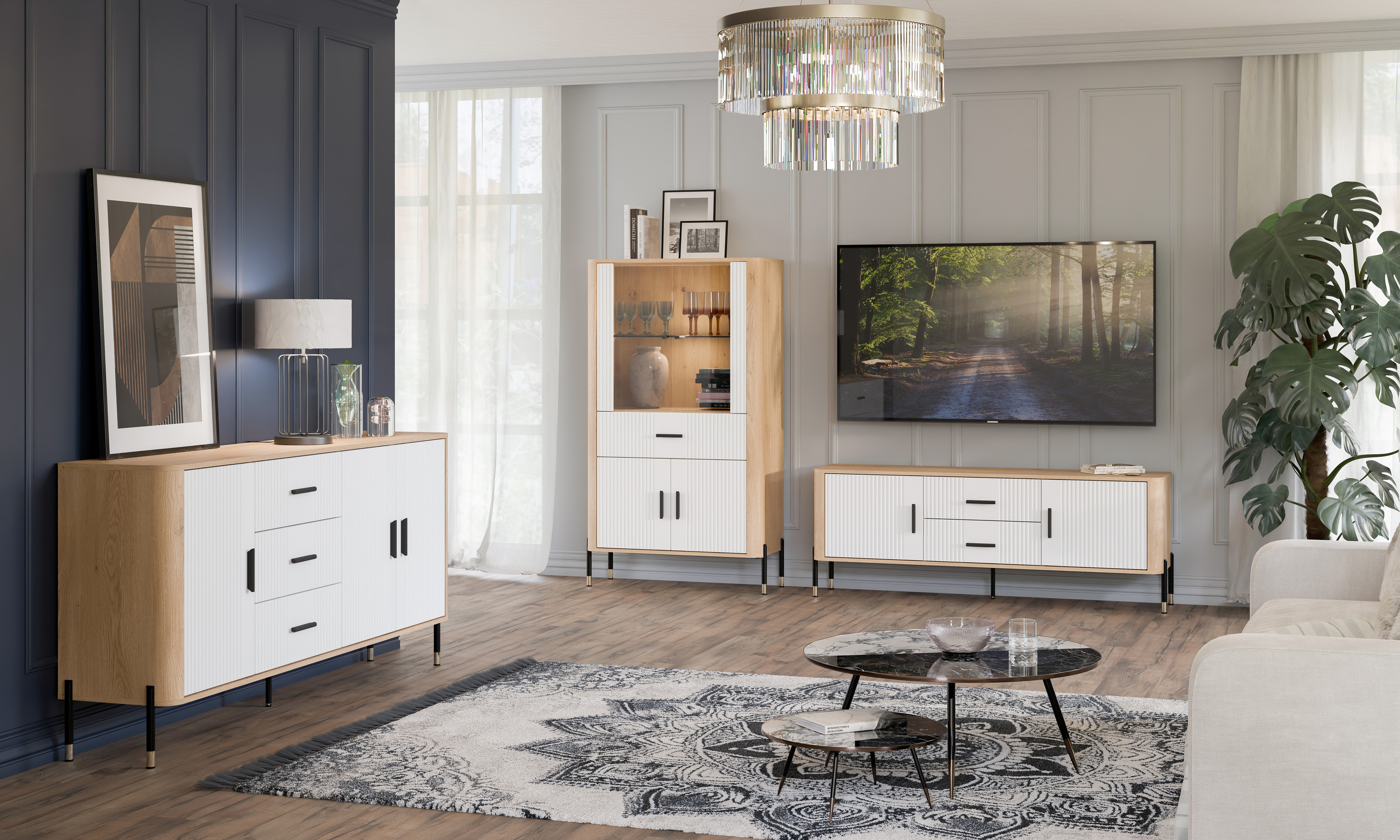 Mebel utrzymany jest w modnej kolorystyce: połączenie białego odcienia o matowej strukturze z dekorem drewna dębowego cremona torro tworzy harmonijny i luksusowy kontrast. Całość wieńczą złote, smukłe uchwyty i metalowe nóżki, które podkreślają nowoczesny, ale ciepły charakter mebla.