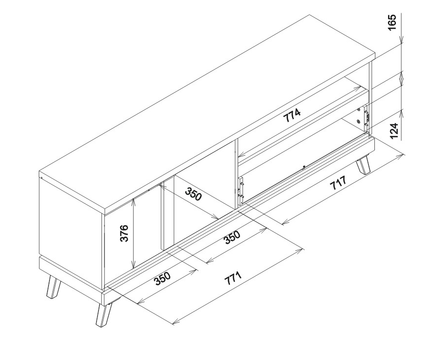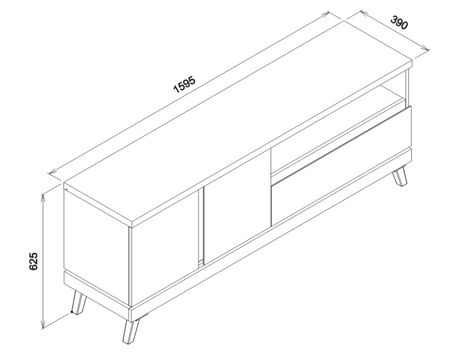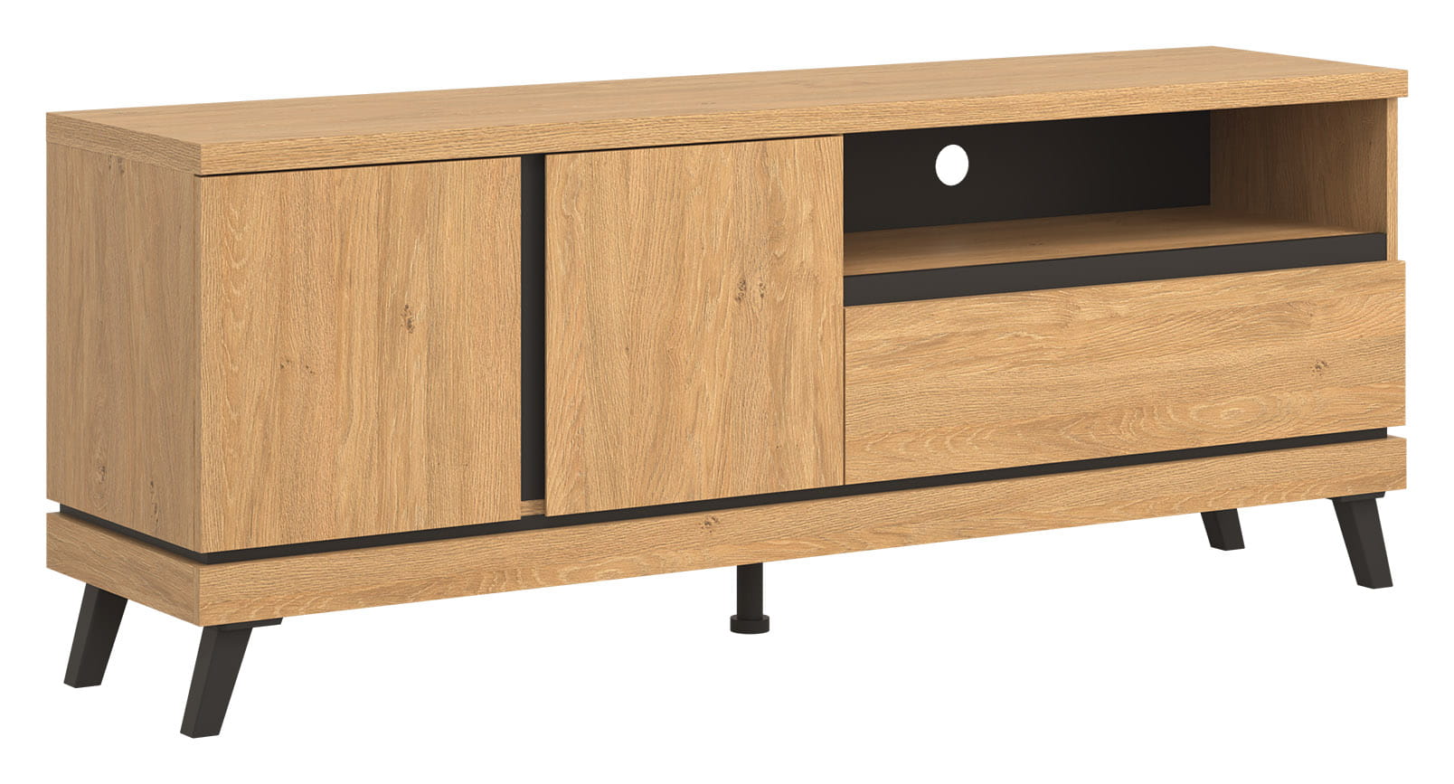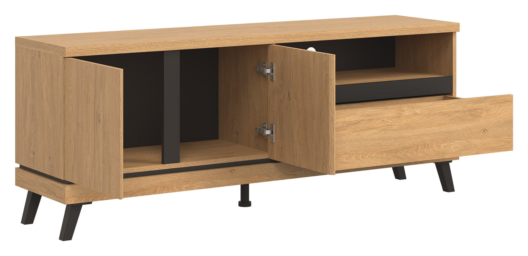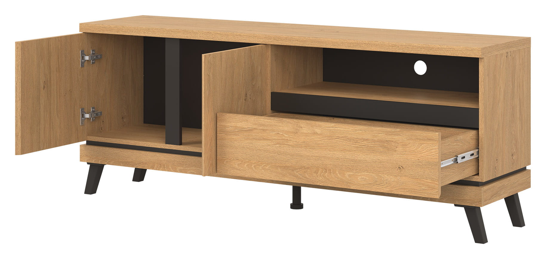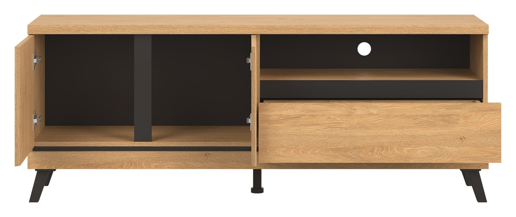 Mebel złożony jest z wnęki otwartej na dekoder, szuflady wyposażonej w wysokogatunkowe prowadnice kulkowe GTV z pełnym wysuwem oraz wnęki zamykanej dwoma drzwiczkami.