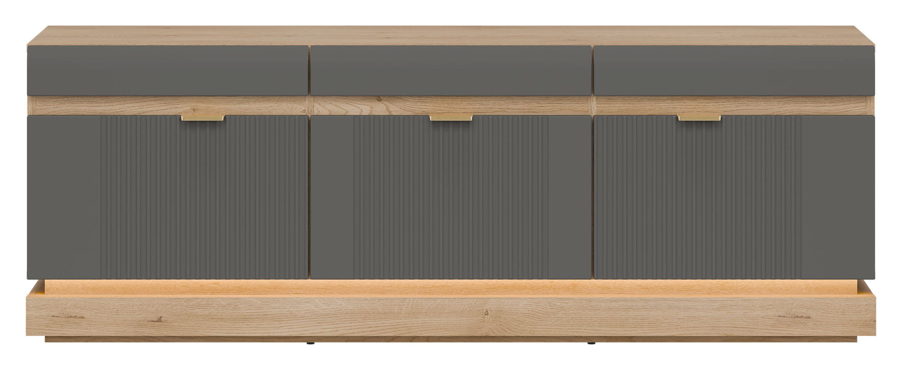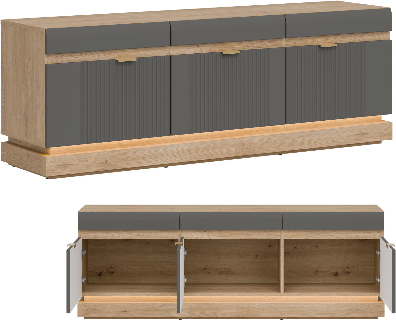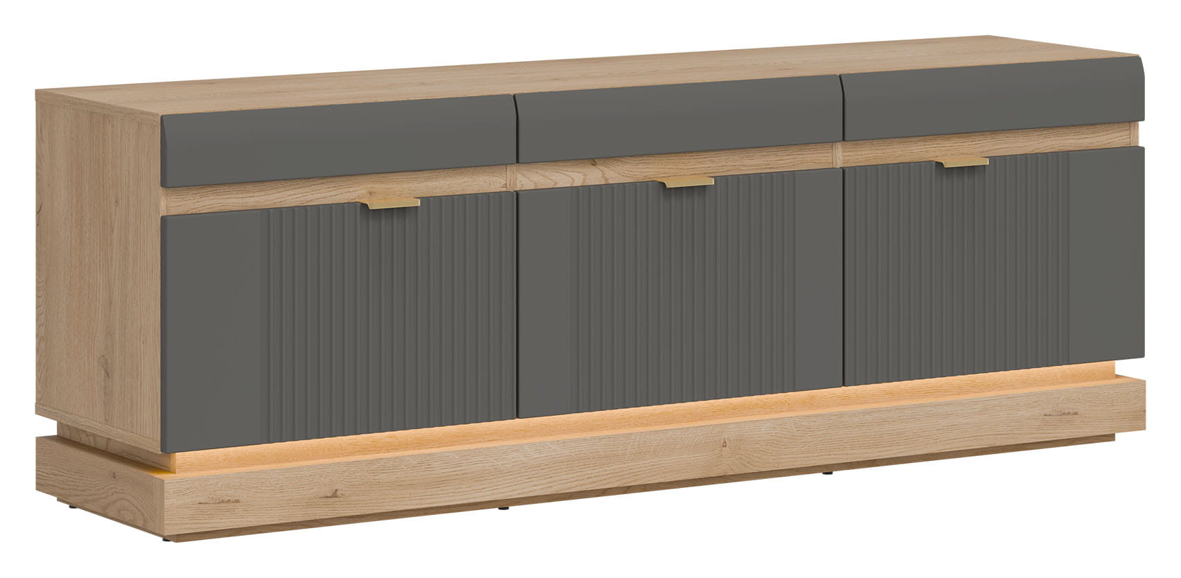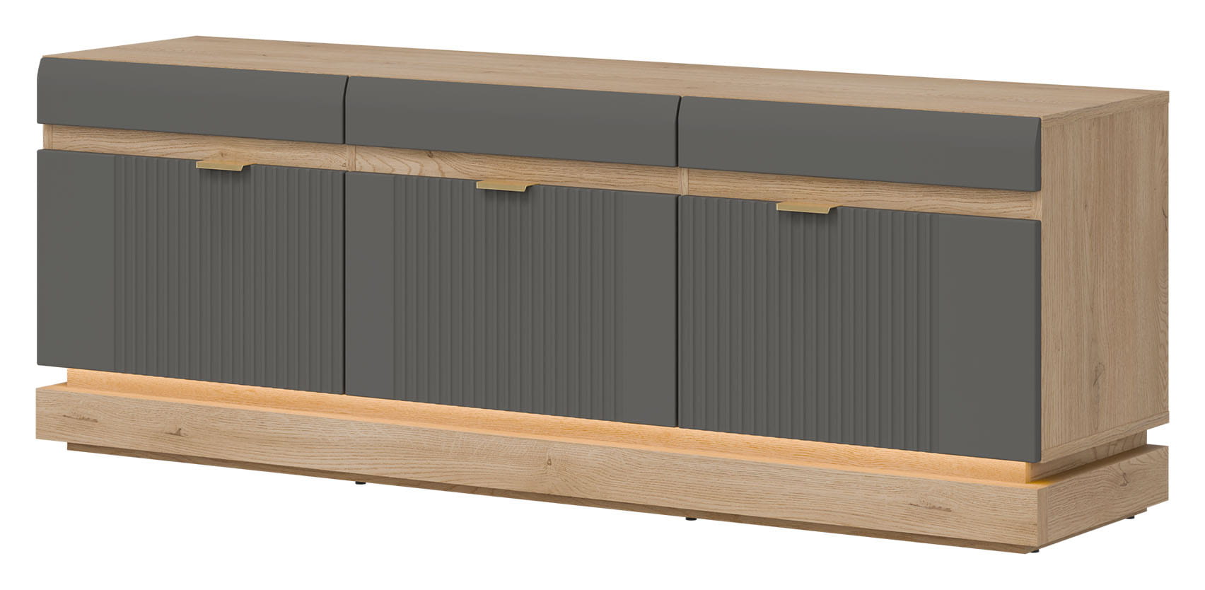 Model ML01 wyróżnia się ponadczasowym designem, łączącym eleganckie fronty w szarym kolorze o matowym wykończeniu z korpusem wykonanym w naturalnym i ciepłym dekorze dąb cremona torro. Uwagę przyciągnie pionowe frezowanie zdobiące drzwiczki, które nadaje meblowi subtelnej dynamiki i wyrafinowanego charakteru. Minimalistyczne uchwyty o złotym wybarwieniu stanowią ciekawy akcent, a opcjonalne oświetlenie LED umieszczone w części dolnej wprowadza nastrojowy klimat i podkreśla lekkość formy. Takie połączenia tworzy spójną i stylową kompozycję, która doskonale odnajdzie się zarówno w nowoczesnych, jak i bardziej klasycznych wnętrzach.