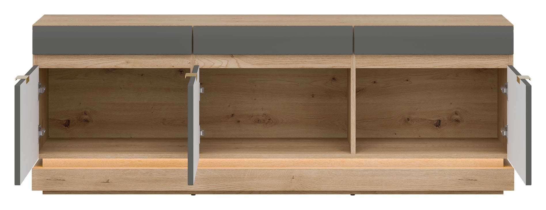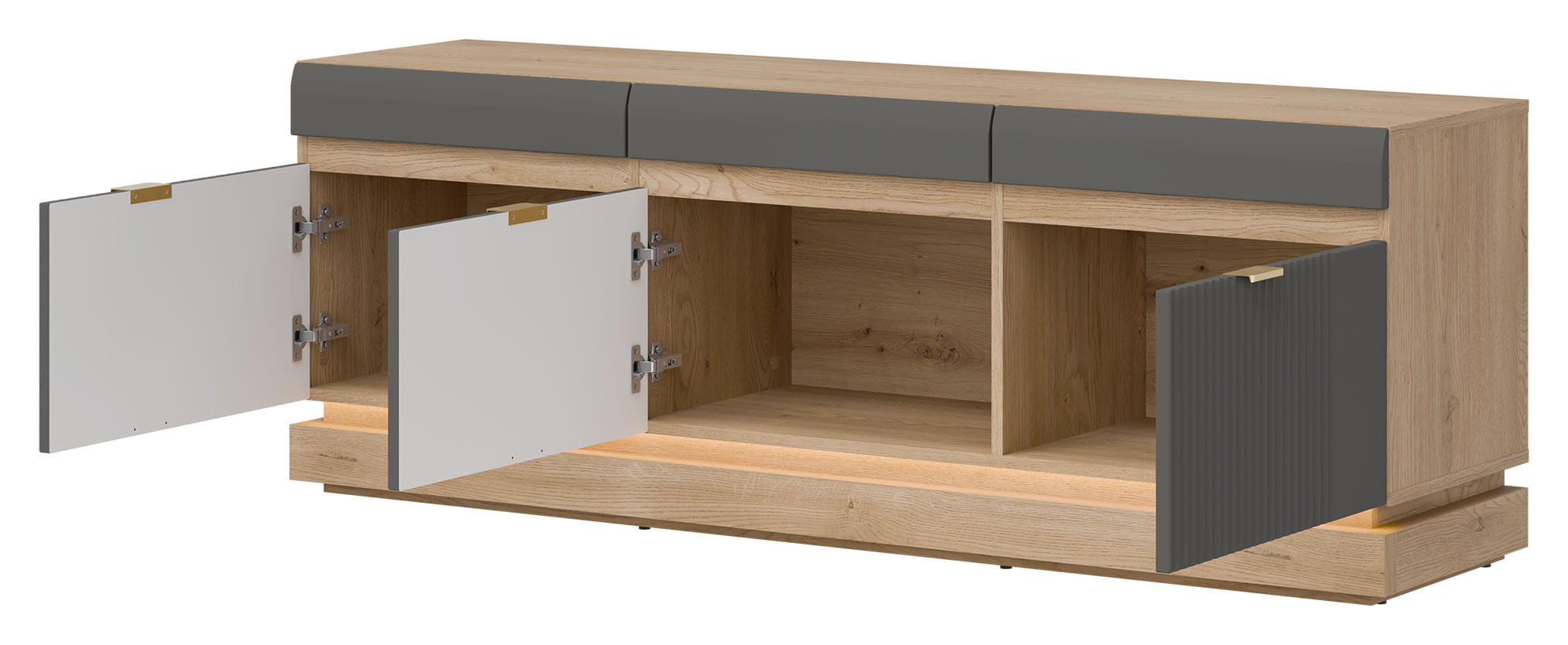 Mebel wyposażony jest w trzy pojemne wnęki zamykane trzema drzwiczkami.