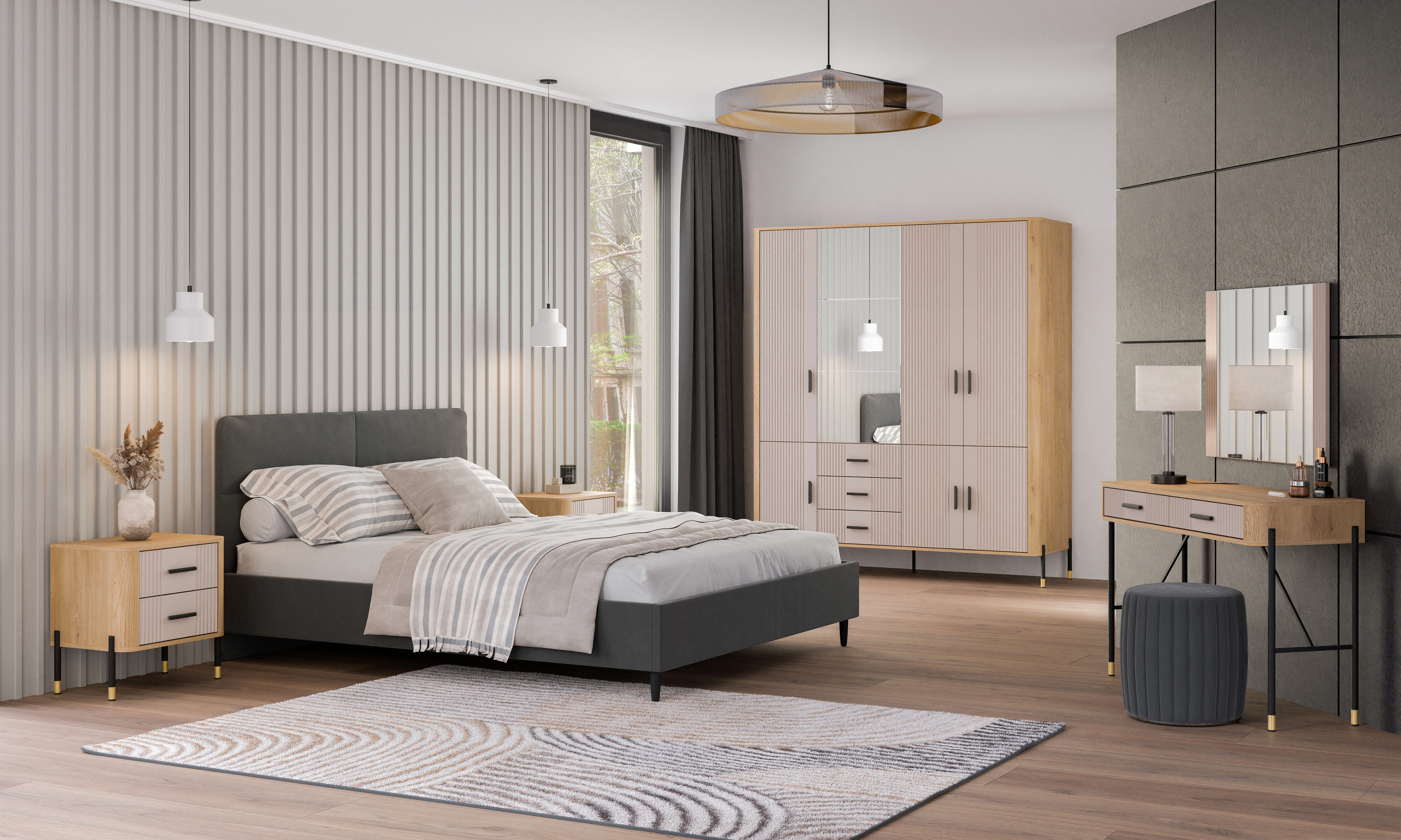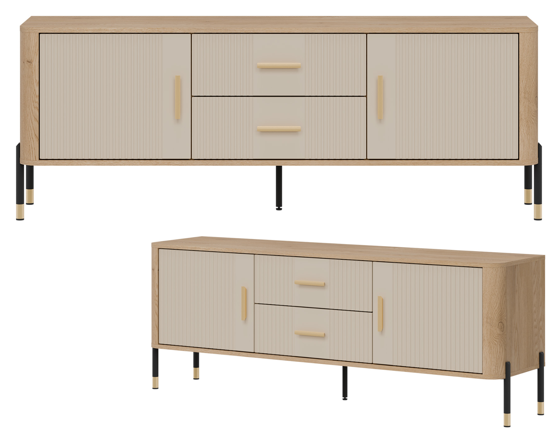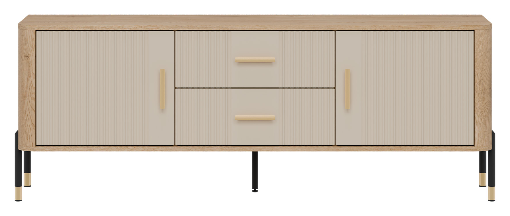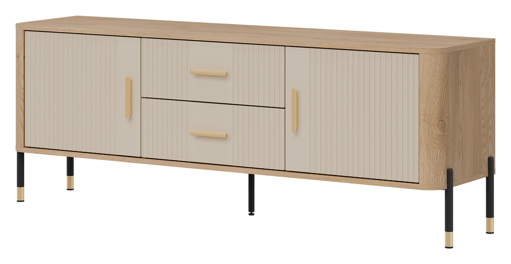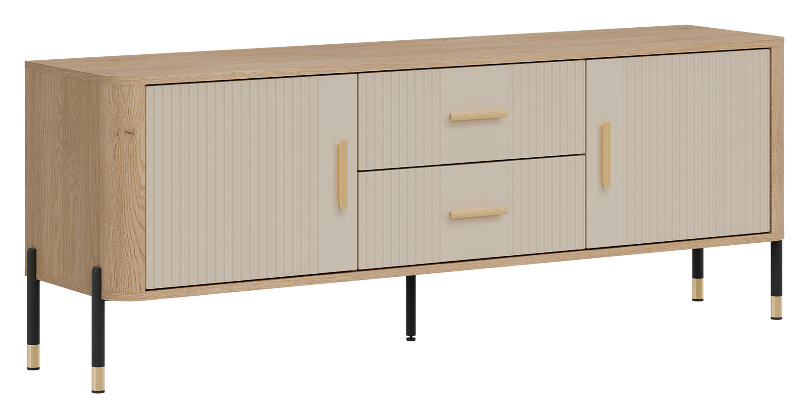 Połączenie naturalnego dekoru dębu cremona torro z ryflowanymi frontami w kaszmirowym kolorze o matowym wykończeniu tworzy wyjątkowy kontrast – subtelny, a zarazem wyrazisty. Złote uchwyty i detale na nogach dodają całości elegancji i lekkości, doskonale wpisując się w klimat nowoczesnych, loftowych i skandynawskich aranżacji.