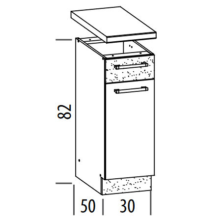 Szafka dolna L/P MD12/D30S1 to stojąca jednodrzwiowa szafka kuchenna z jedną półką w środku oraz jedną szufladą pochodząca z kolekcji mebli modułowych MODENA. Sprawdzi się idealnie w kuchni jako praktyczne miejsce służące do przechowywania sztućców oraz przyborów kuchennych.