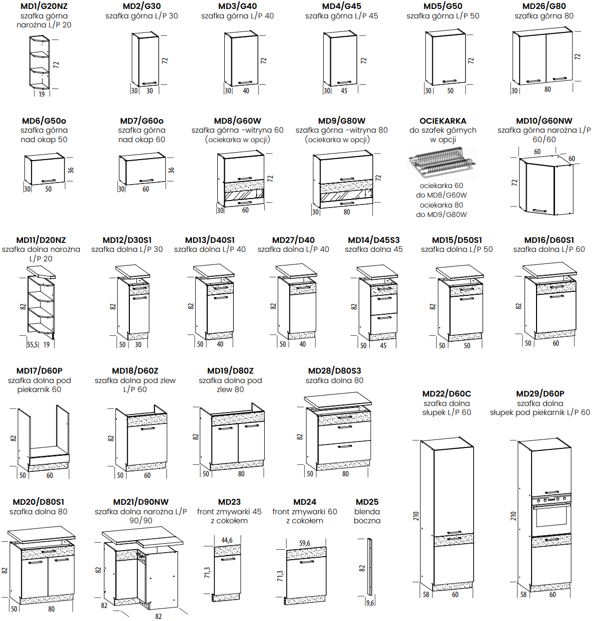 Stwórz samodzielnie własny zestaw wybierając z 29 segmentów systemu modułowego mebli MODENA lub wybierz jeden z trzech gotowych zestawów o szerokościach 220 cm, 240 cm oraz 260 cm w czterech wariantach kolorystycznych (biały połysk, rijeka jasna, rijeka ciemna oraz buk) dostępnych w naszej ofercie.